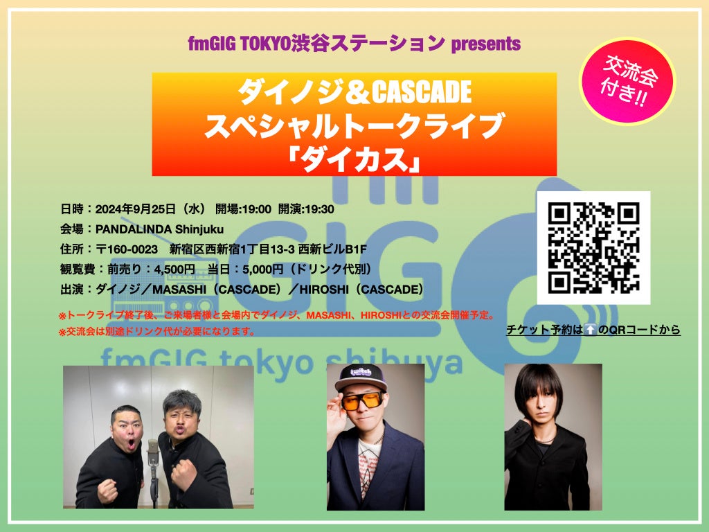 fmGIG TOKYO渋谷ステーションで番組を担当しているお笑い芸人、DJとして活躍している「ダイノジ」と、数々のヒット曲を生み、2009年に再結成し、現在も精力的に活動しているロックバンド「CASCADE」のMASASHI(Gt)、HIROSHI(Dr)が4ヶ月ぶりにトークライブを開催する事が決定しました。