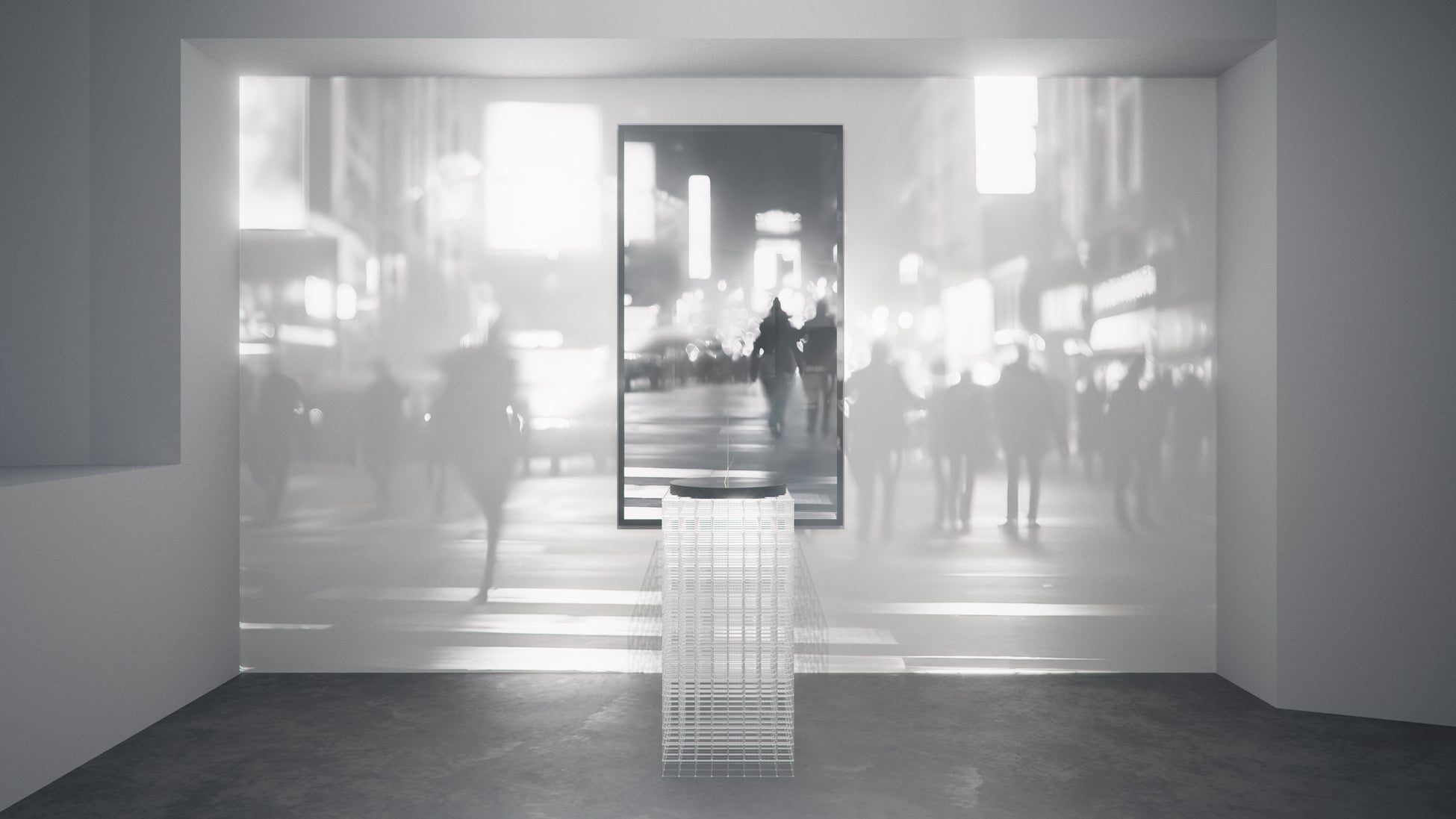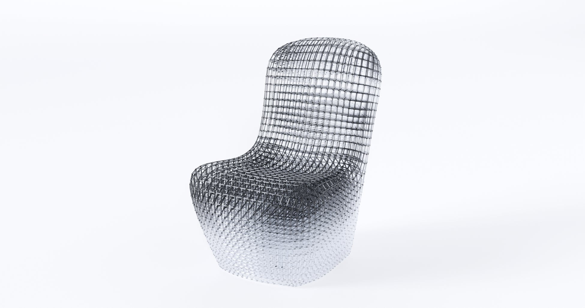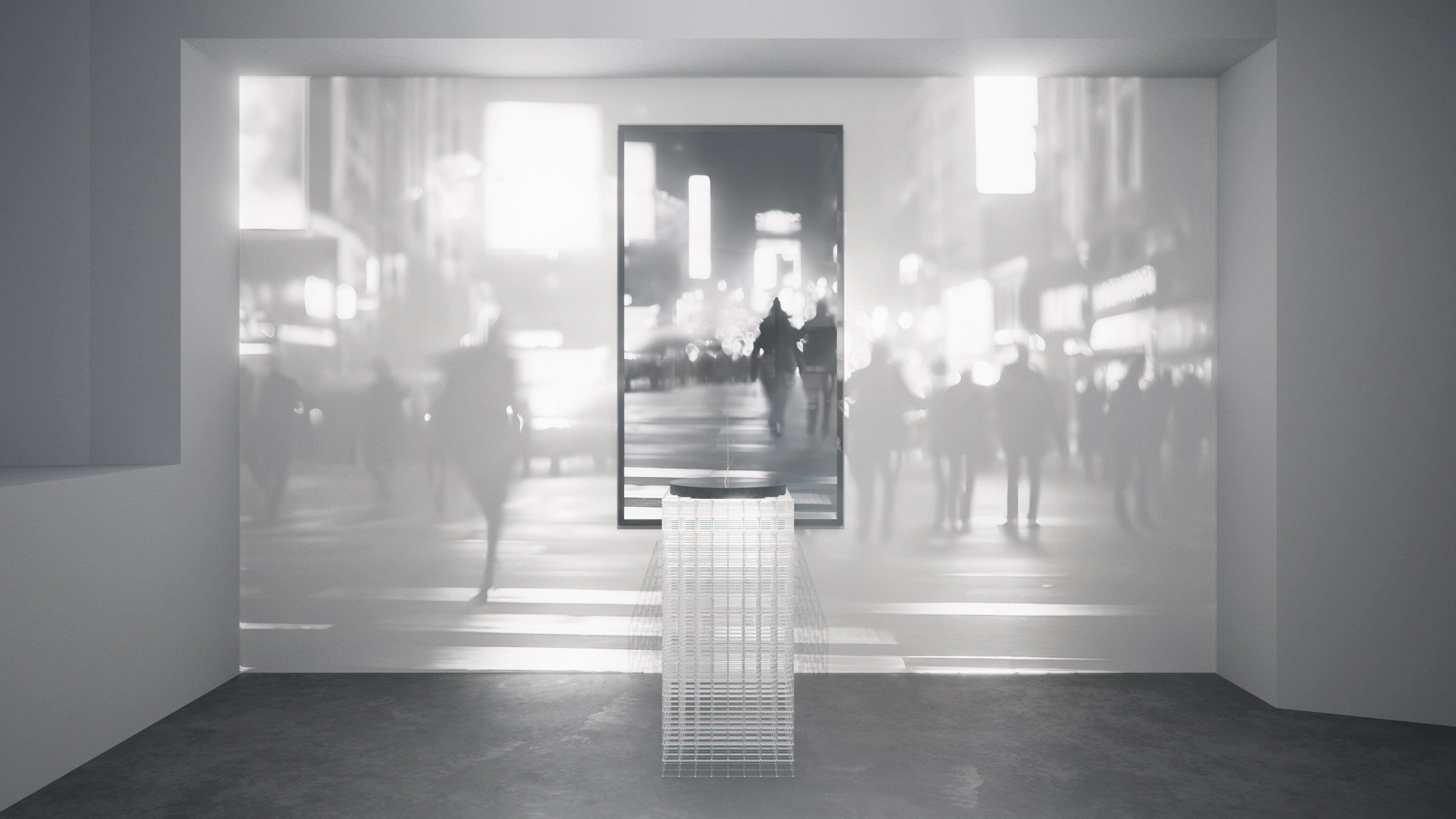 黒から透明へと移ろうグラデーションが、つい先ほどまでそこにあった身体の体温、重さ、時間の経過を示唆します。残るのは人物そのものではなく、不在によって輪郭づけられる“影”です。光を透過する構造体は、鑑賞者の視点によって密度と奥行きを変え、最近まで誰かがそこにいたような静かな存在感を呼び起こします。