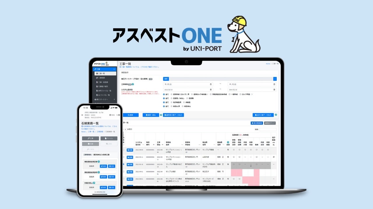 株式会社EMSが提供する「アスベストONE」は、石綿(アスベスト)法令の遵守と業務管理の効率化を実現するクラウドシステムです。 累計で13000社以上の企業様にご利用いただいており、GビズIDを用いた事前調査報告申請の簡易化や、書面・看板の自動作成機能を提供しています。