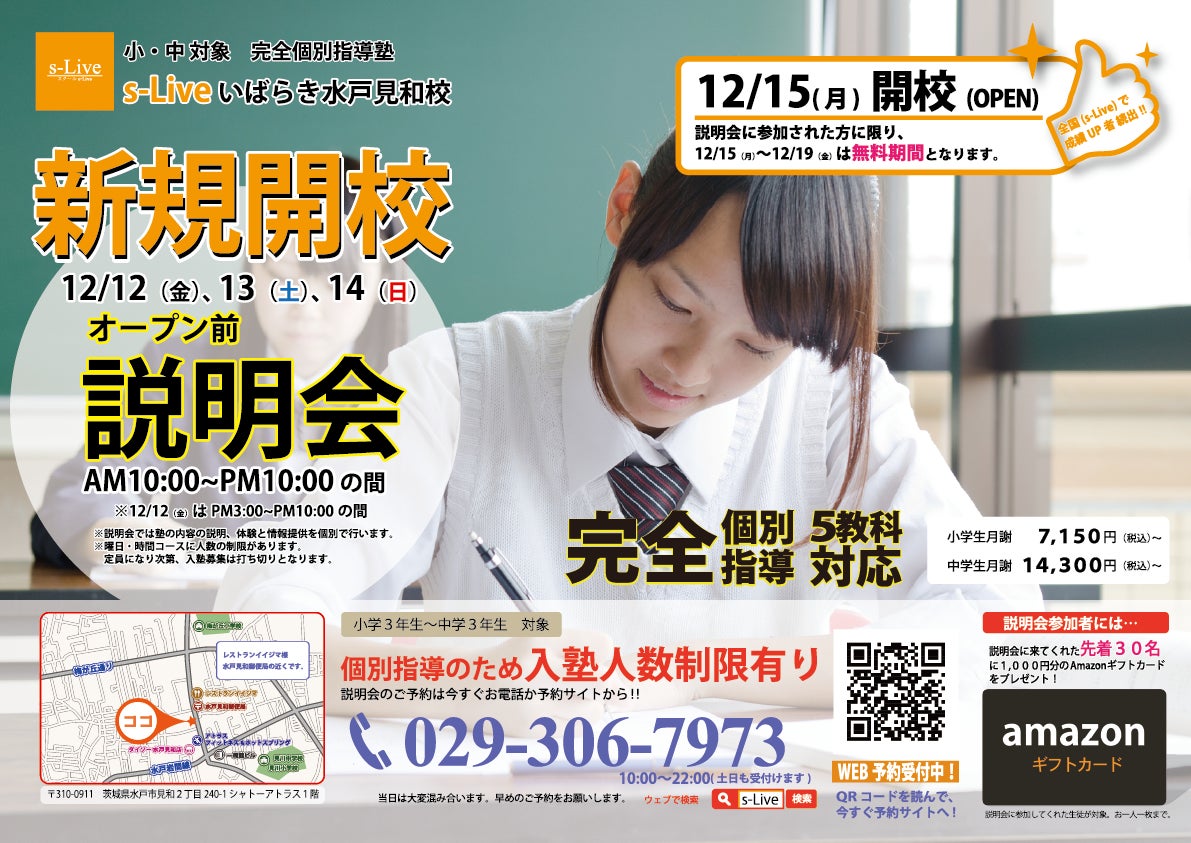 個別指導塾s-Liveは12月15日、茨城県水戸市見和に新校舎をオープン。12月12日~12月14日の3日間で開校前説明会を開催する。