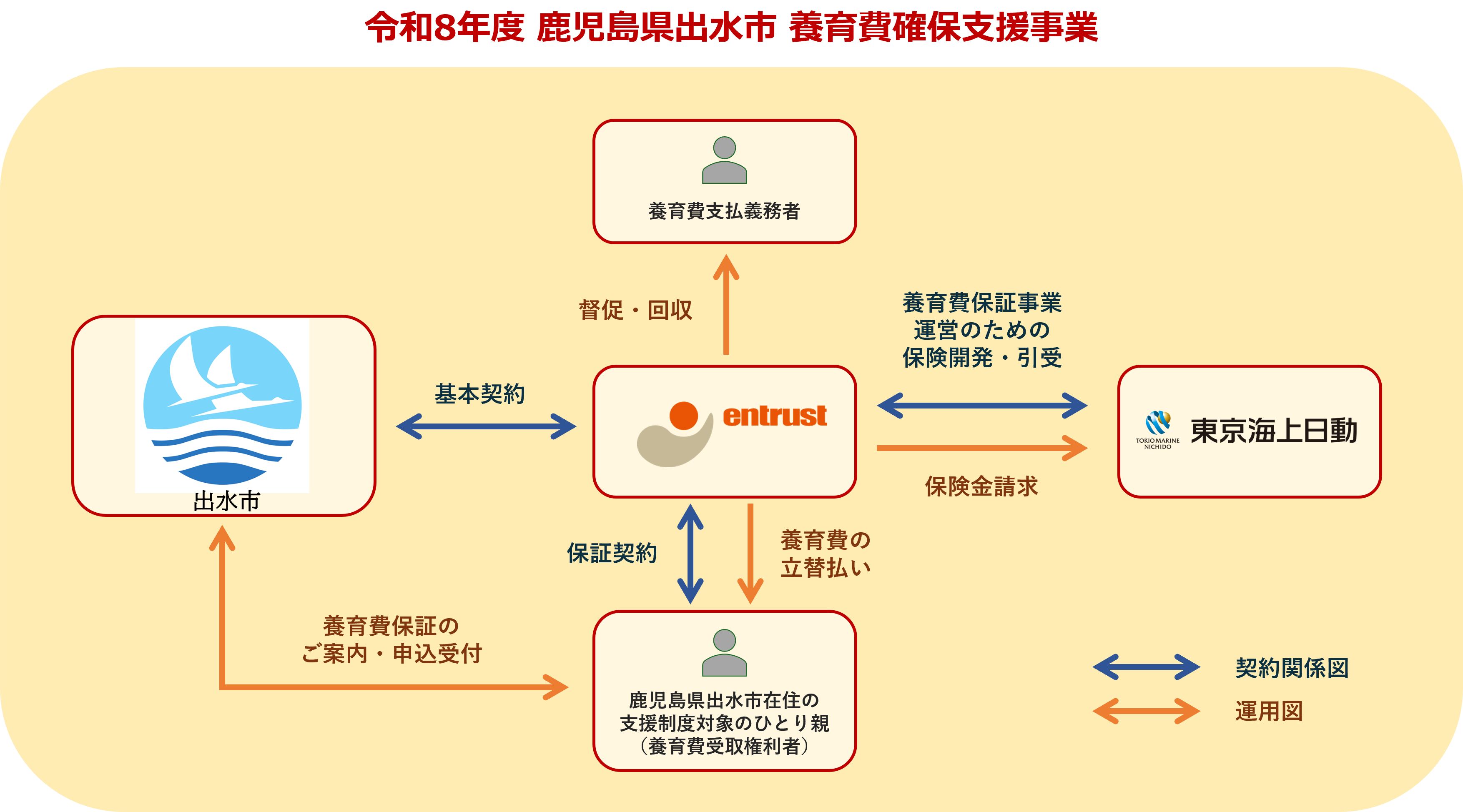 今回出水市にご利用いただく『養育費保証』は、出水市にお住まいのひとり親世帯と当社が個別に保証契約を締結する、地方自治体に向けた商品スキームです。初年度にかかる保証料の負担、および制度対象者へのご案内・申込受付は、地方自治体にて実施します。