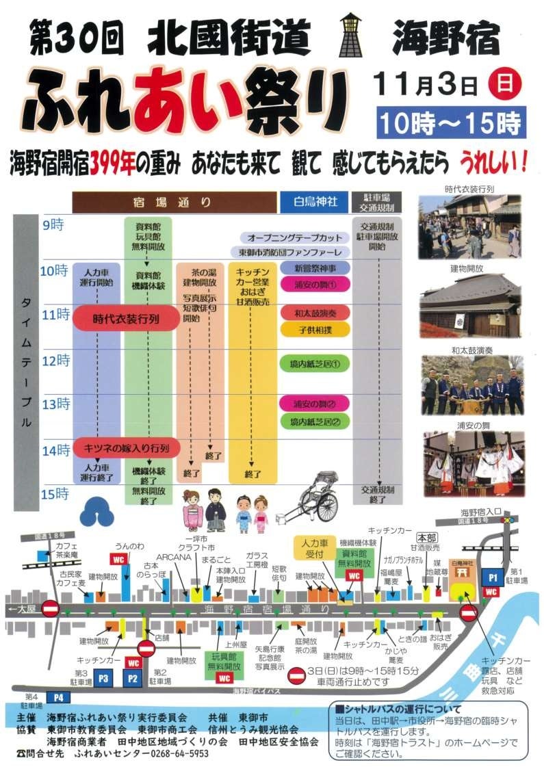 ◆駐車場:海野宿第1駐車場、第2駐車場、第3駐車場、海野マレットゴルフ駐車場(河川敷)、および東御市役所駐車場(市役所からはシャトルバスの運行があります)。※すべて駐車無料