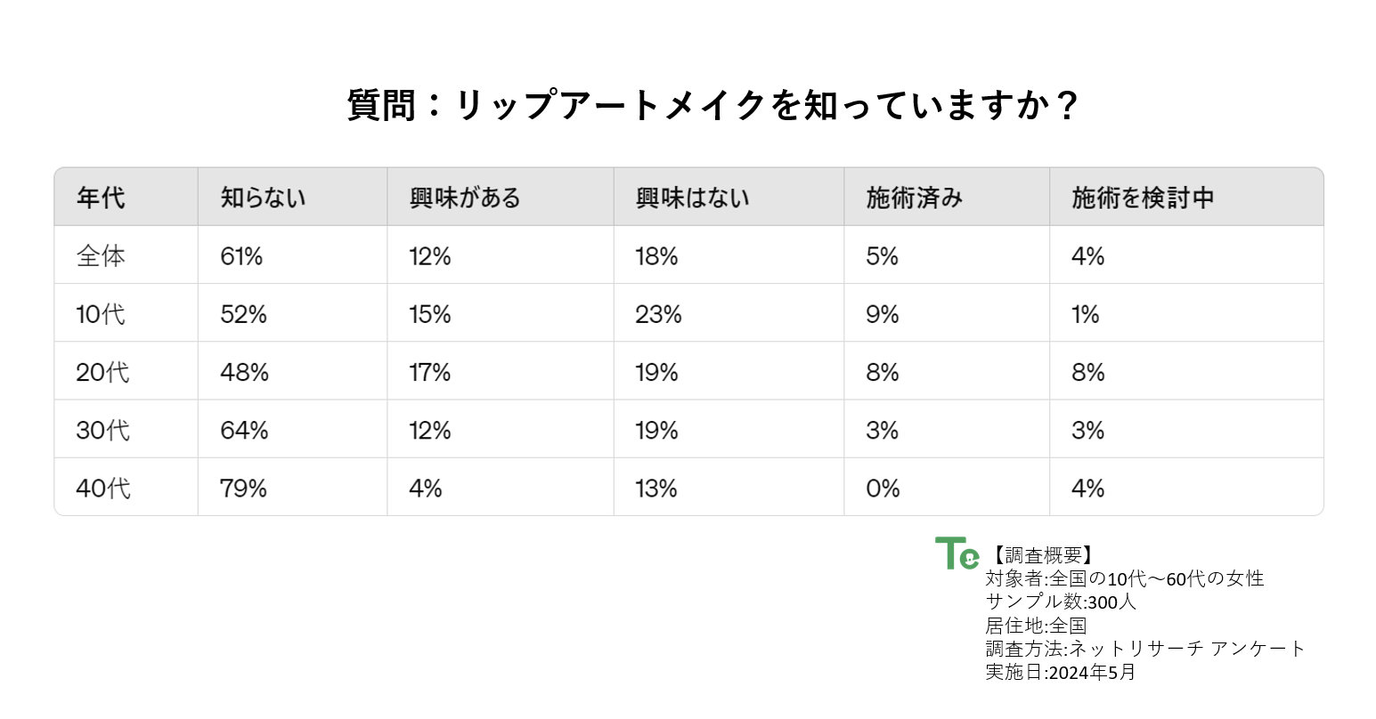 全体の12%がリップアートメイクに興味があり、特に若い世代ではその割合が高い結果となっています。興味はあるけれどもまだ試していない人々が多いのも事実。この新しいビューティートレンドがもっと知られるようになれば、より多くの人がこの美容法を試してみたくなるでしょう。