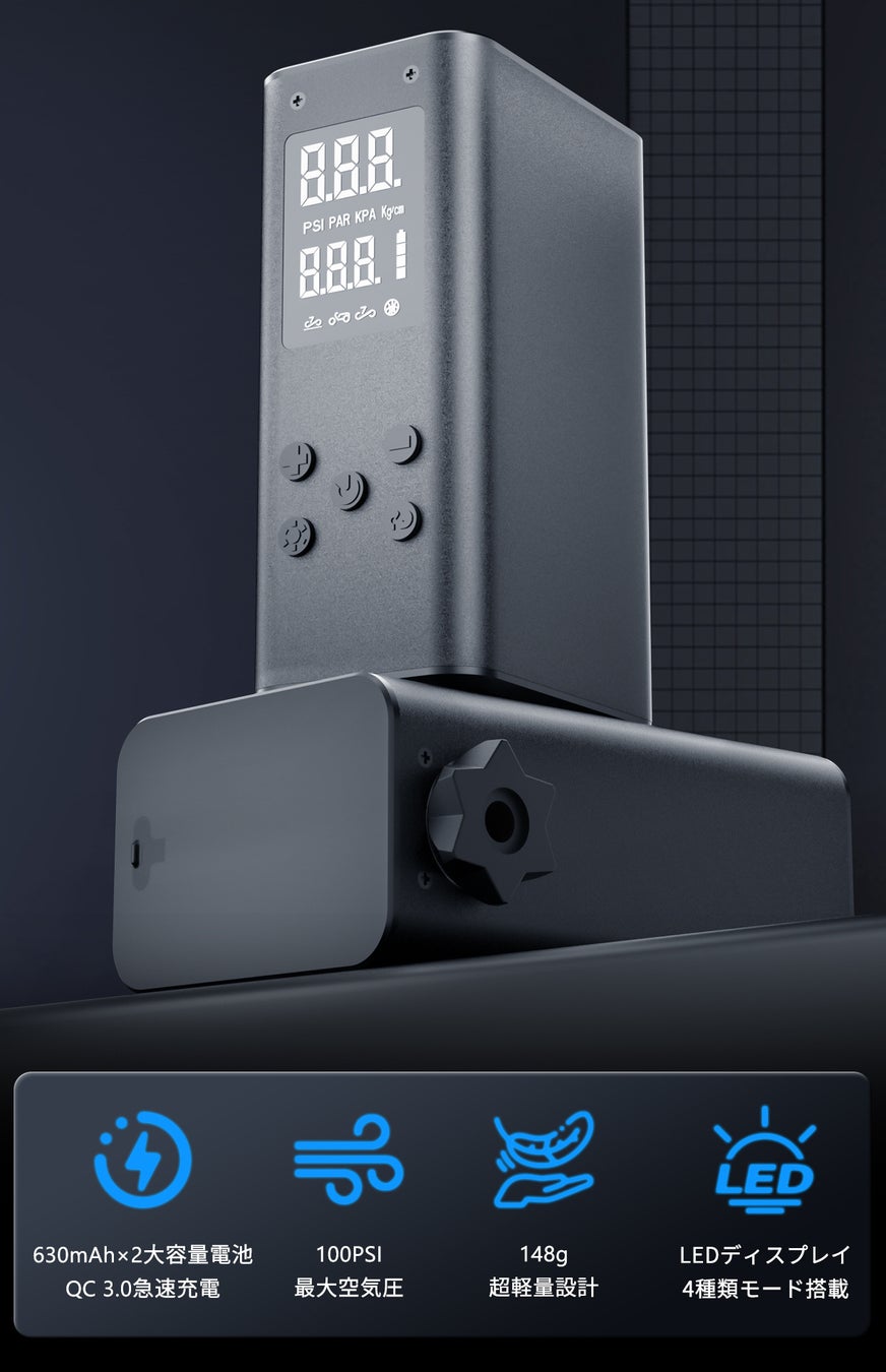 ・4種類の空気入れモード搭載!自転車とボールのみならず、バイクにも使える!・アルミニウム合金製で軽くて頑丈!重さわずか148g、どこにでも簡単に持ち運び可能!・最大充填空気圧は100PSI