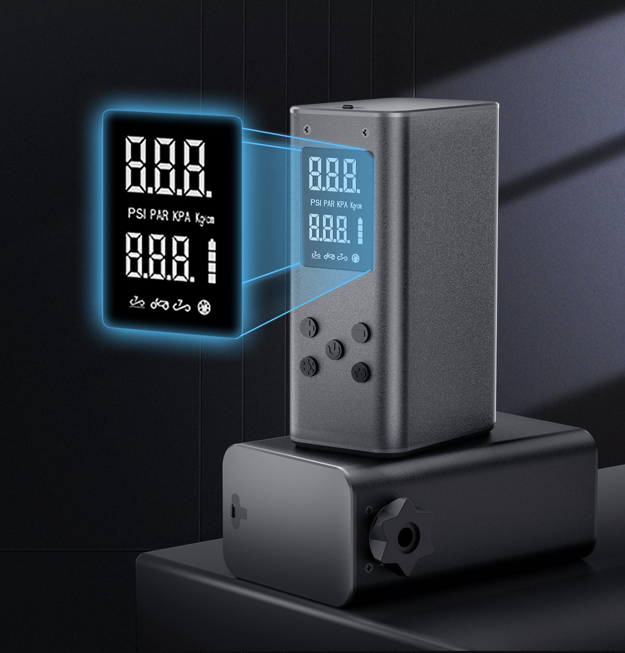 操作をより効率的かつ直観的にできるように、「HT05」にはディスプレイが搭載されており、現在の空気圧と目標空気圧、バッテリー残量、モード、空気圧単位などが一目瞭然!