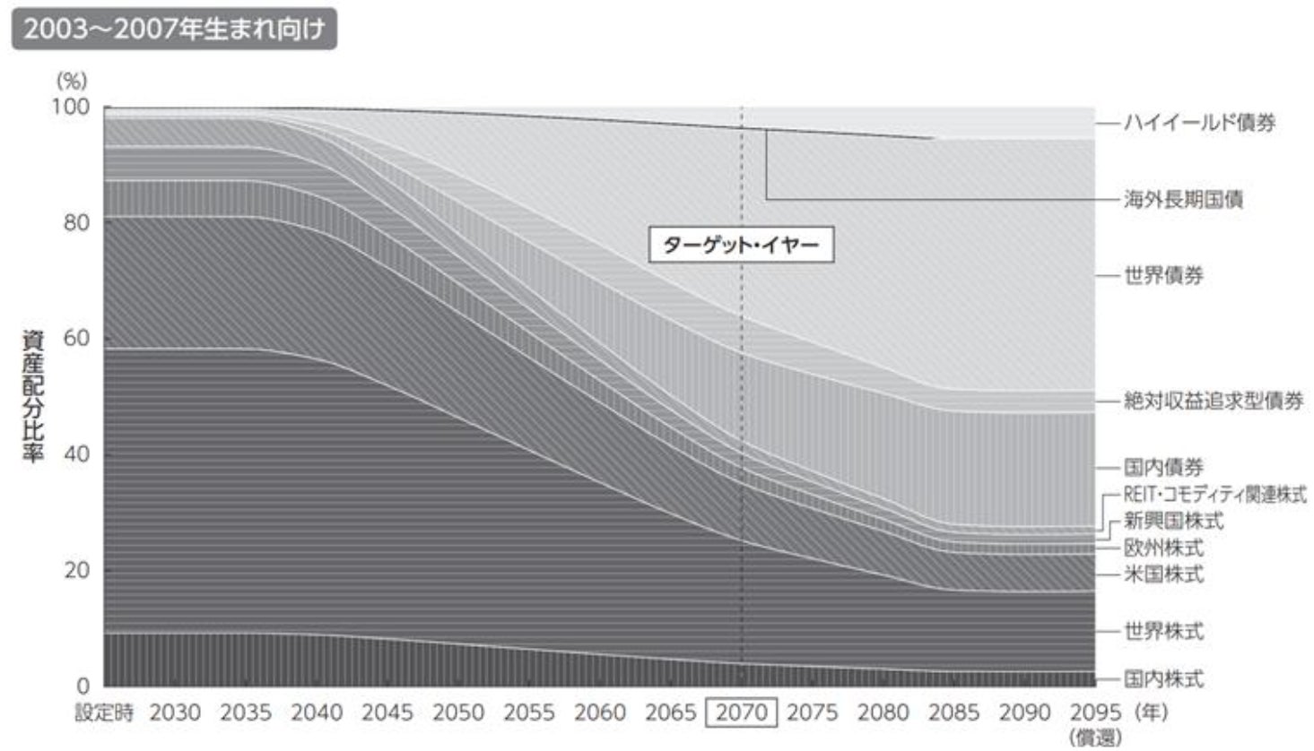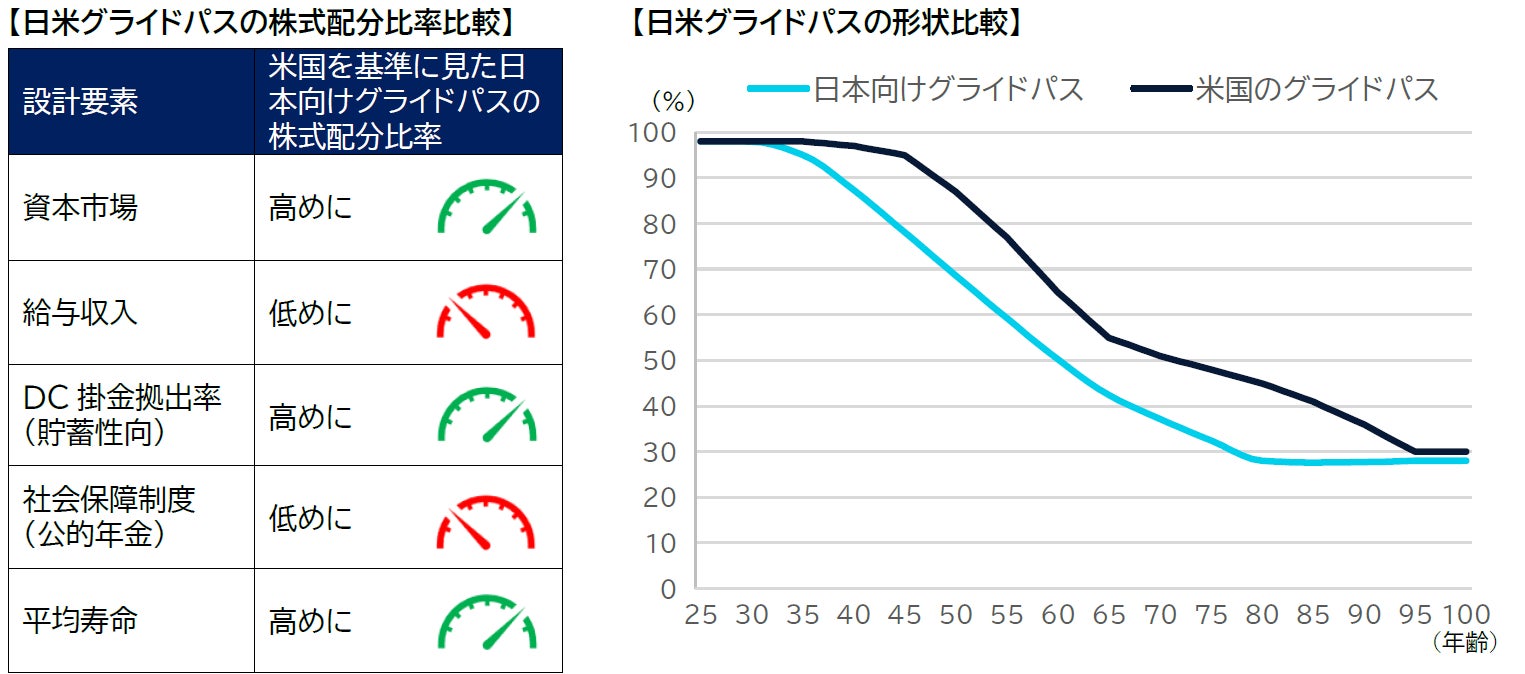 日本の社会保険料は比較的高く、公的年金の給付額は手厚いため、日本向けグライドパスでは株式資産の配分比率は低めになることが示唆されます。