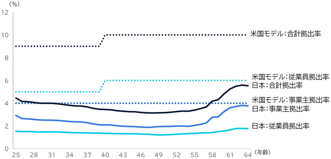 日本ではDC掛金拠出率が若年から50代半ばにかけて低下傾向となるため、リスク資産投資の必要性は高まると示唆されます。