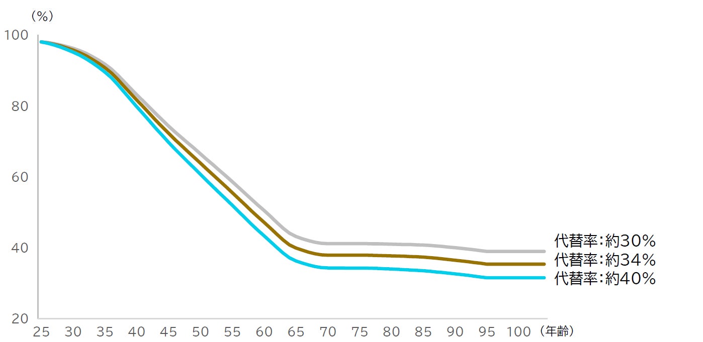 ※国民年金は生涯年収平均額の最大18.3%を消費代替、厚生年金は同最大21.6%を消費代替。これらを合算した代替率約40%を起点に試算。