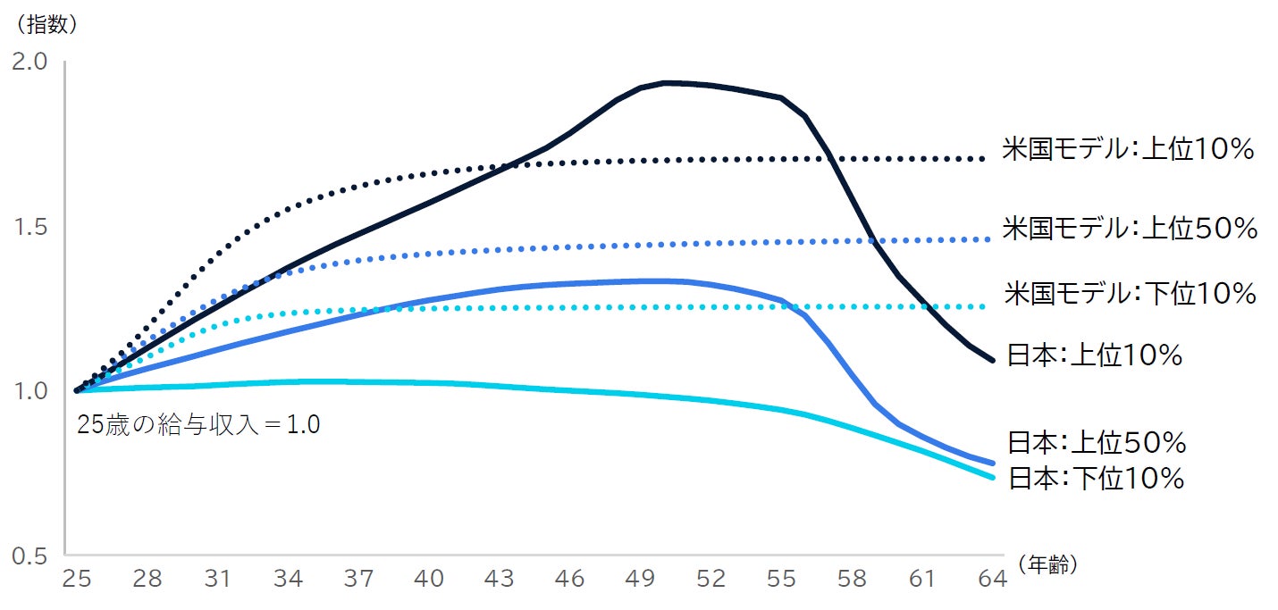 日本では高齢期の年収が下降傾向となり、退職近くになって消費支出が減少するため、リスク資産投資の必要性は低下すると示唆されます。