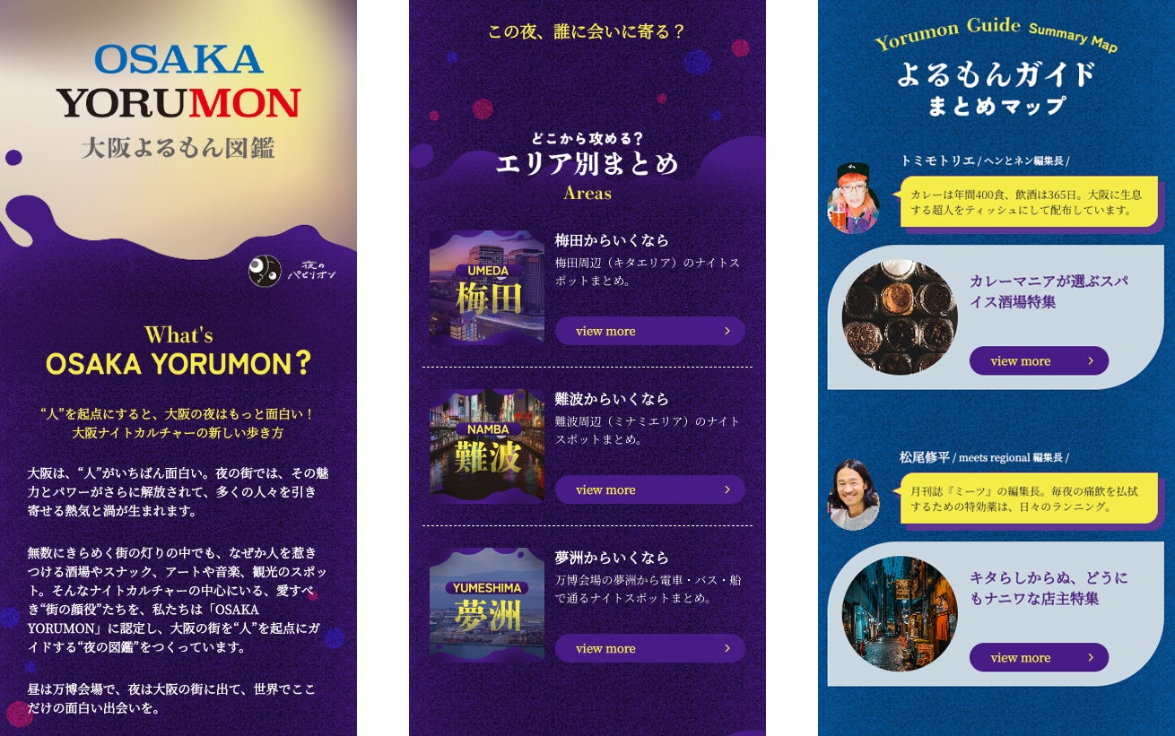まず、「エリア別YORUMONまとめ」では、梅田・難波・夢洲の各エリアからアクセスしやすいYORUMON(=おもろい大阪人)をピックアップ。万博帰りにふらっと立ち寄れる夜のスポットがひと目で分かります。