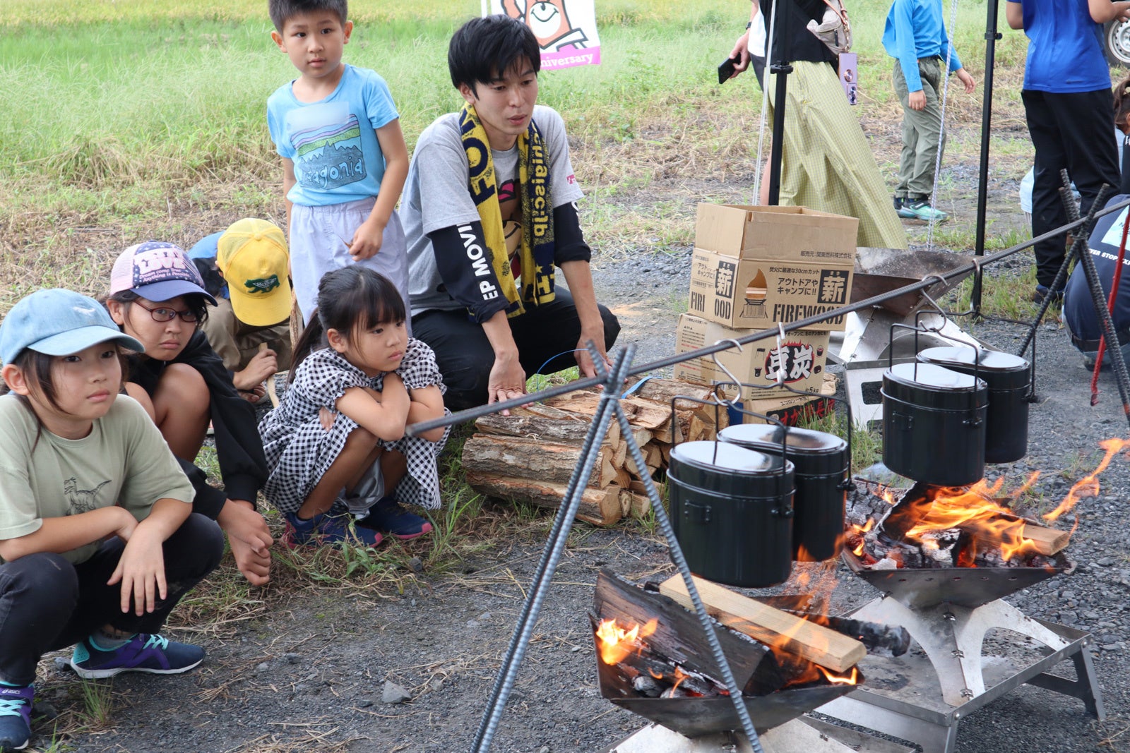 稲刈りの後は、実際に飯ごうでお米を炊いて食べる飯ごう炊飯を体験しました。約半分の子どもが飯ごうを見るのが初めてでしたが、WILD-1スタッフから飯ごうの使い方、米・水の計量の仕方の説明を受けたあとは、年上の子が年下の子どもたちに優しくアドバイスしながら炊飯に取り組みました。