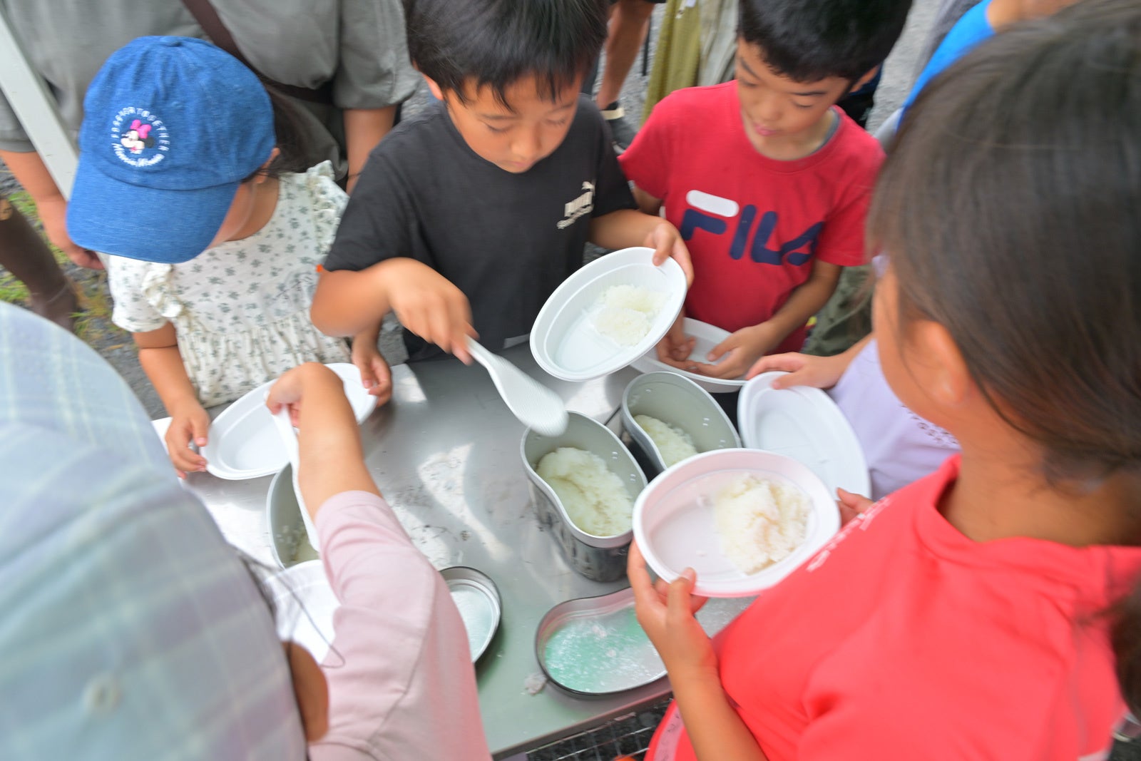 飯ごうを焚火にかけ、やがて湯気とともに食欲をそそる香りが漂い始めると、子どもたちは待ちきれない様子で飯ごうを見守ります。そして、いよいよ炊きたてのお米を味わう時がやって来ました。「稲刈りを頑張った分、すごくおいしい!」と大喜び。みんなで力を合わせて作ったご飯を味わいながら、自然の恵みと努力の成果を実感している様子でした。