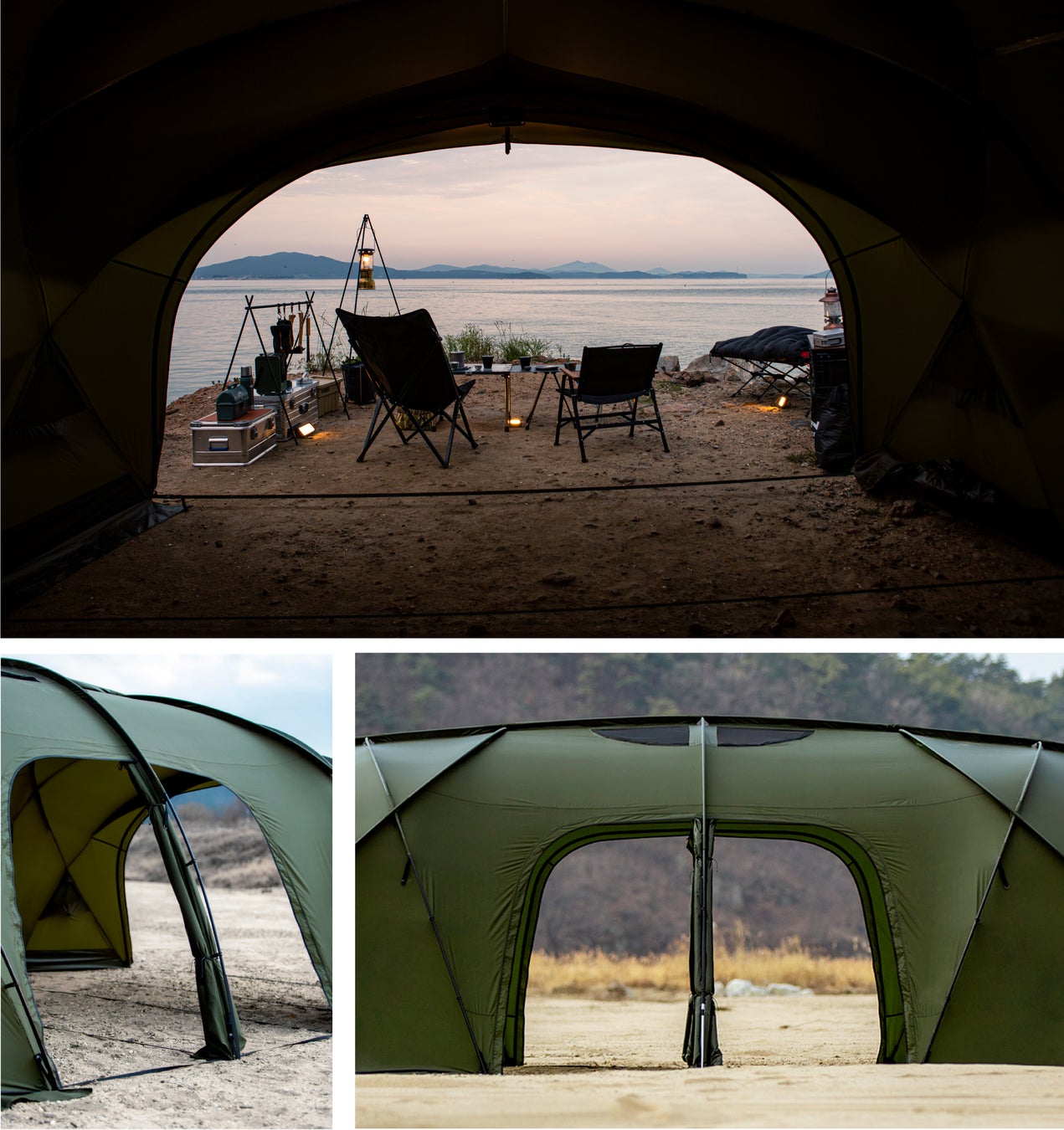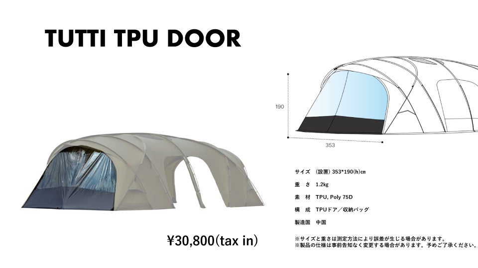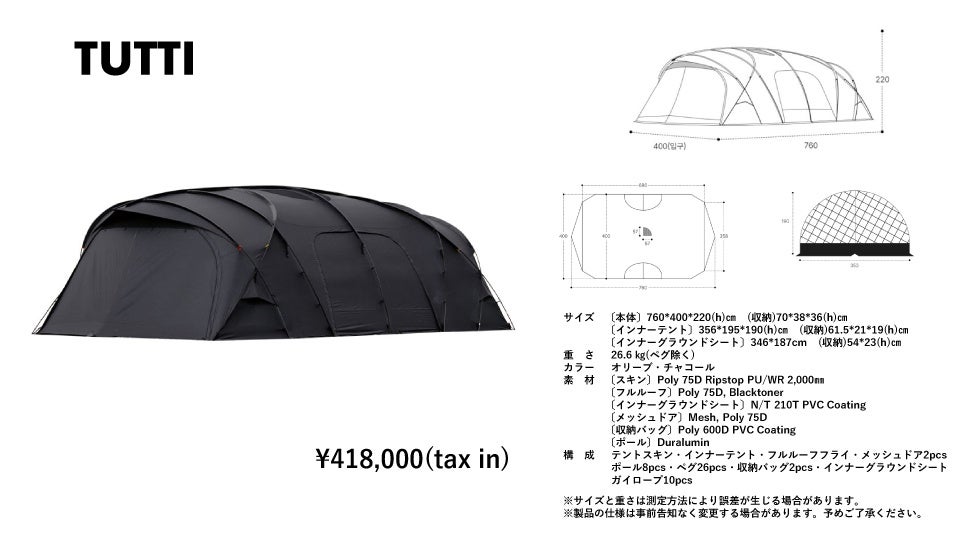 イタリア語で「みんな」「全部」を意味する"TUTTI"の名を冠した7.6mの大型リビングテントは「すべてを包容し、みんなのための空間として共に過ごす時間を特別にする。」そんな想いが込められた前/後面の開放感と天井の高い空間を持ち合わせたテントです。
