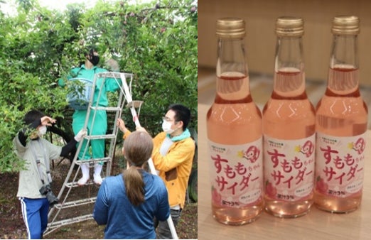 本学農学部は2020年4月に開設。2021年3月、農業振興・食などについて地域課題の解決や地域の活性化を目的に、枚方市と連携協定を締結しました。同市杉地区には古くから「すもも団地」と呼ばれる地域があり、すももは特産品として知られていました。このすももに着目して、学生プロジェクトチームを発足させ、サイダーのレシピを開発、同年秋に「すももちゃんサイダー」として完成させました。香料や着色料は一切使用せず、すもも本来の淡いピンク色で、さわやかな酸味を楽しめます。特産品を再生させたと注目を集め、2022年から枚方市のふるさと納税返礼品にも採用されています。