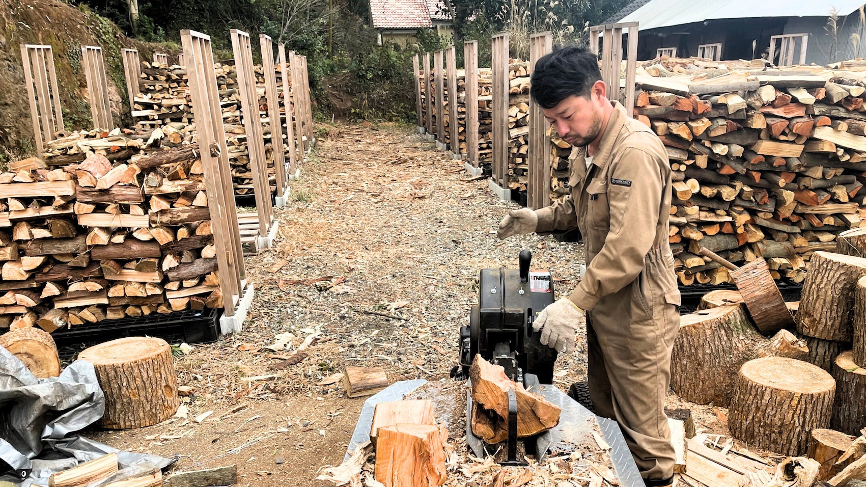 菊本さんは循環型社会を実現するため、伐採や造成などで発生した不要な木材を買い取り、薪の生産販売を行っています。
