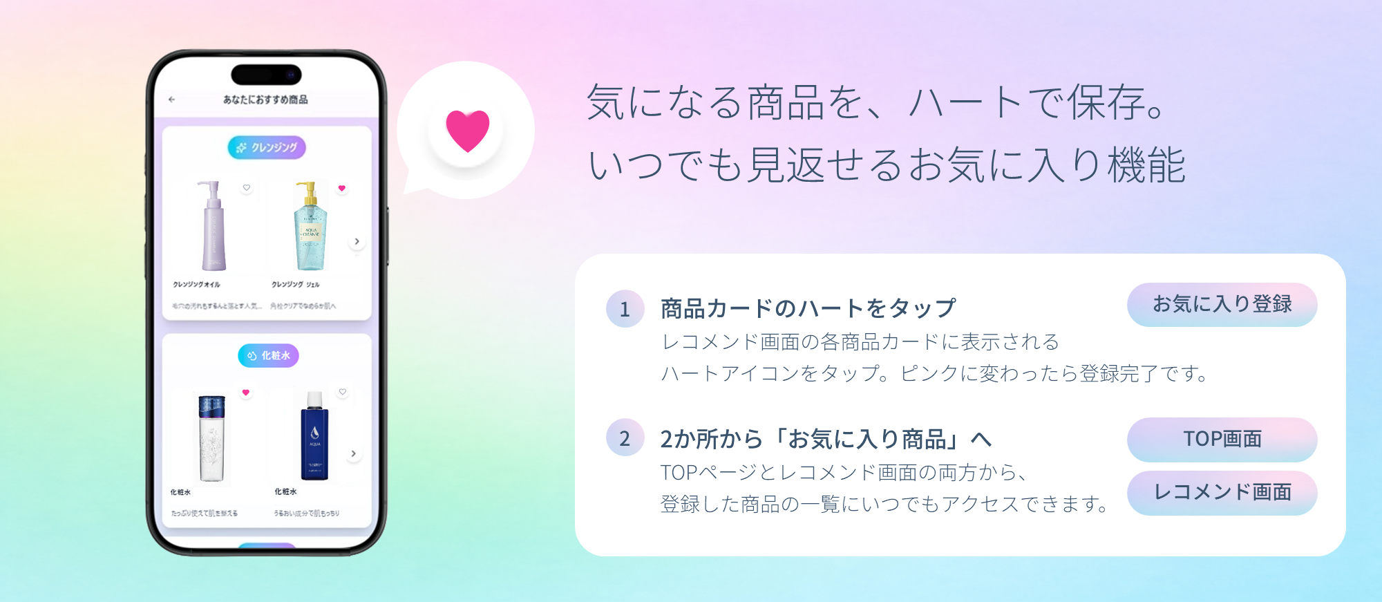 レコメンドされた商品の中から気になるアイテムを見つけたとき、商品右上のハートボタンをタップするだけでお気に入りに登録できる機能を追加しました。