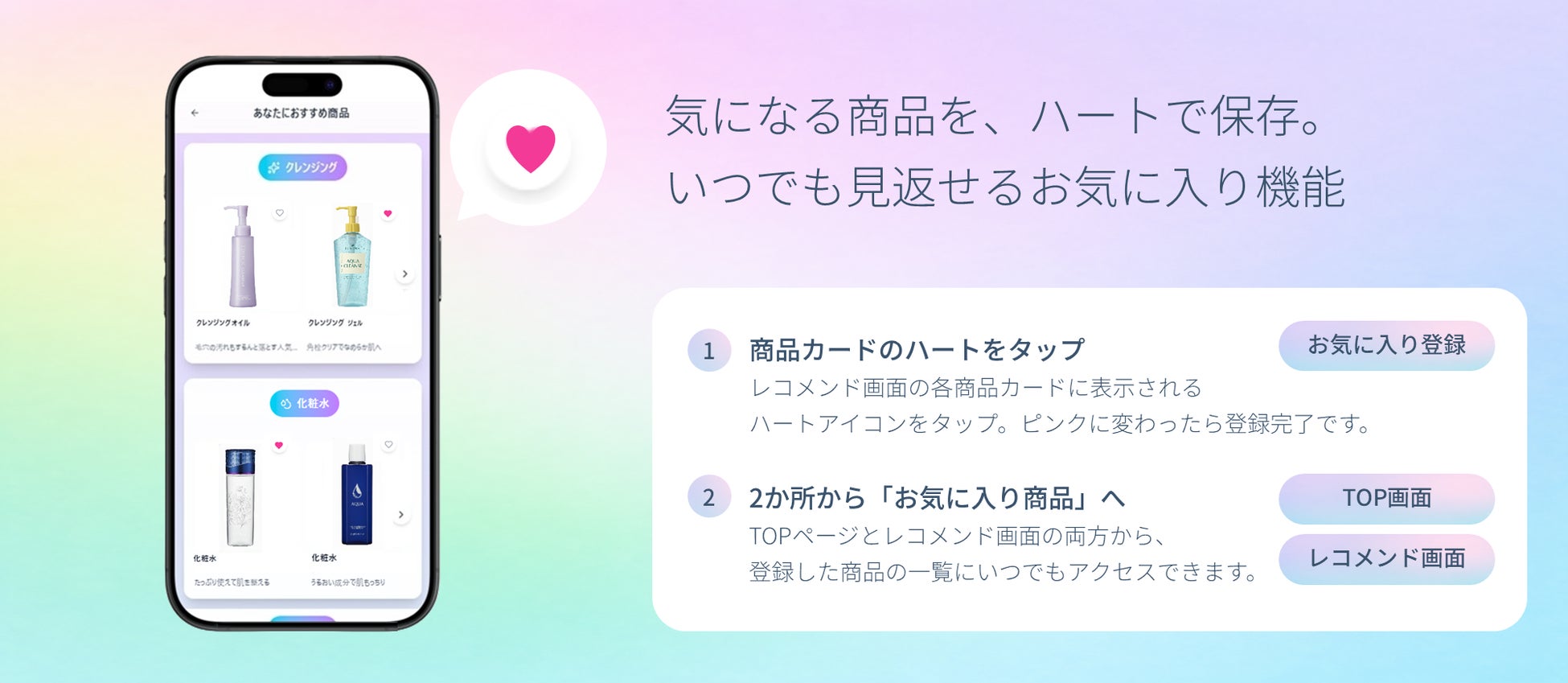 これまではレコメンド商品をあとから見返す手段がありませんでしたが、本機能により気になった商品を「お気に入り商品」として残せるようになりました。登録したアイテムはTOPページおよびレコメンド画面からいつでも確認できます。これにより、「お店に行ったときに確認したい」「今のアイテムが無くなったら切り替えたい」など、購入検討を自分のペースで進める使い方が可能になります。