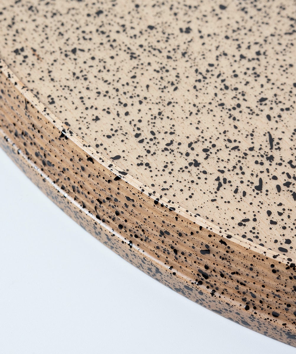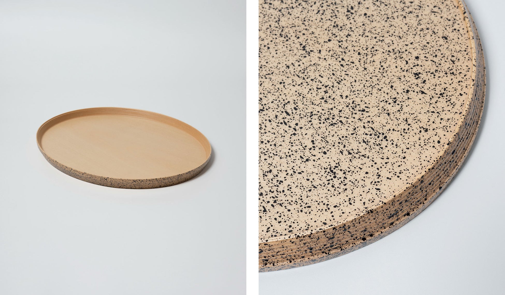 本企画では、ブナ材のしなやかさを活かしたBUNACOのトレイに、本来は日常で使うために生まれた技術である石目模様の吹付塗装を重ねることで、素材が持つ柔らかさと、道具としての機能の強さが共存する、新たな日用品のかたちを目指しました。