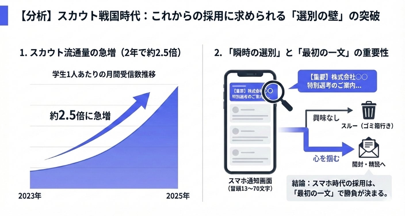 近年の新卒採用市場では、企業から学生に送られるスカウト数が急増し、いわゆる「スカウト戦国時代」に突入しています。