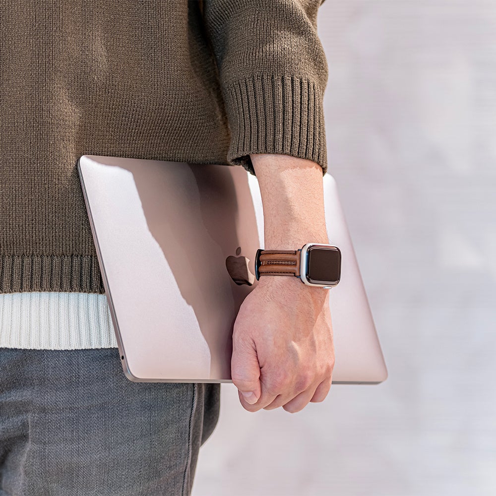 ナチュラルな印象のブラウンは、カジュアルにもつけられて普段使いしやすいのがポイント。レザーバンドは、ラフな服の日もコーディネートをグッと引き締めてくれます。