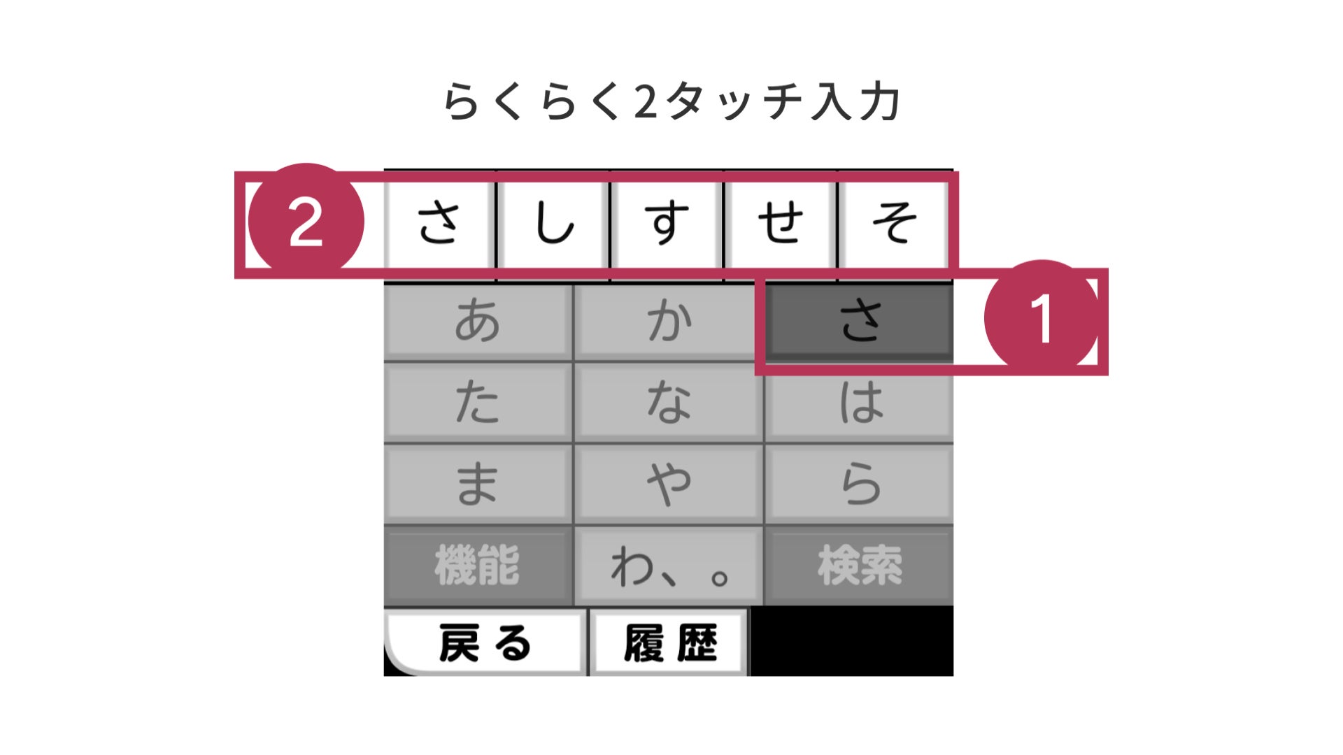文字入力はSuper ATOK ULTIASを搭載しており、「らくらく2タッチ入力」によって入力間違いを防ぎやすくするので、あんしんしてお使いになれます(らくらくフリック入力に切り替え可能)。