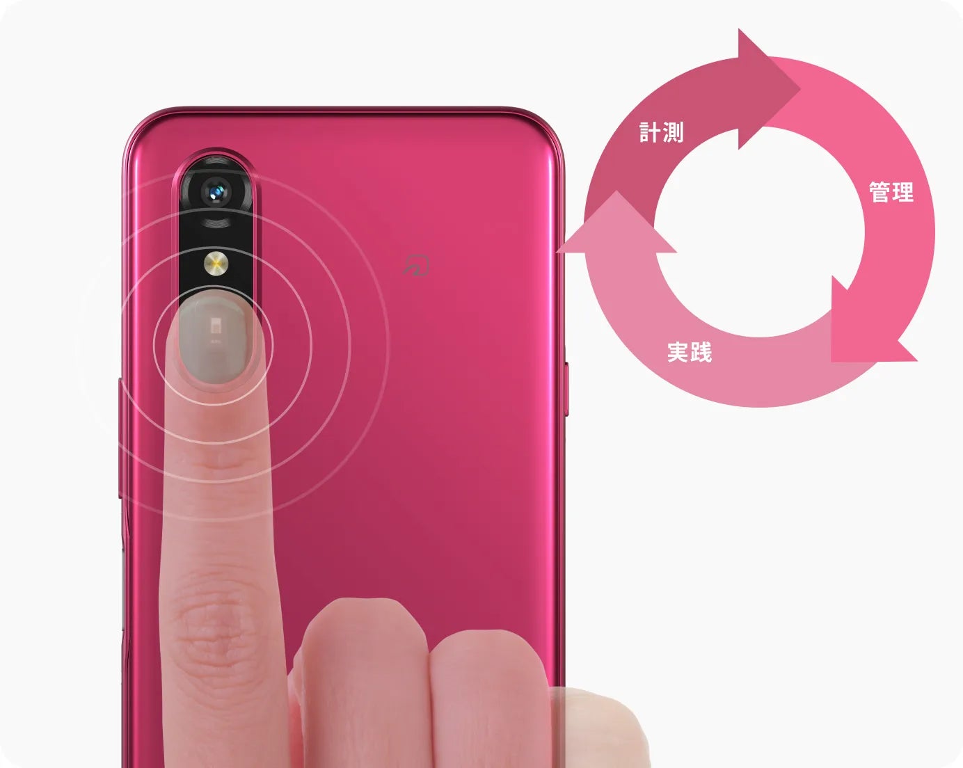 背面カメラ下のセンサーが指先のバイタルデータを読み取り、自律神経のはたらきを測定します。全身の機能をコントロールする自律神経の活性度を示す自律神経パワーと、心身のアクティブ度を示す自律神経バランスの2つがわかります。