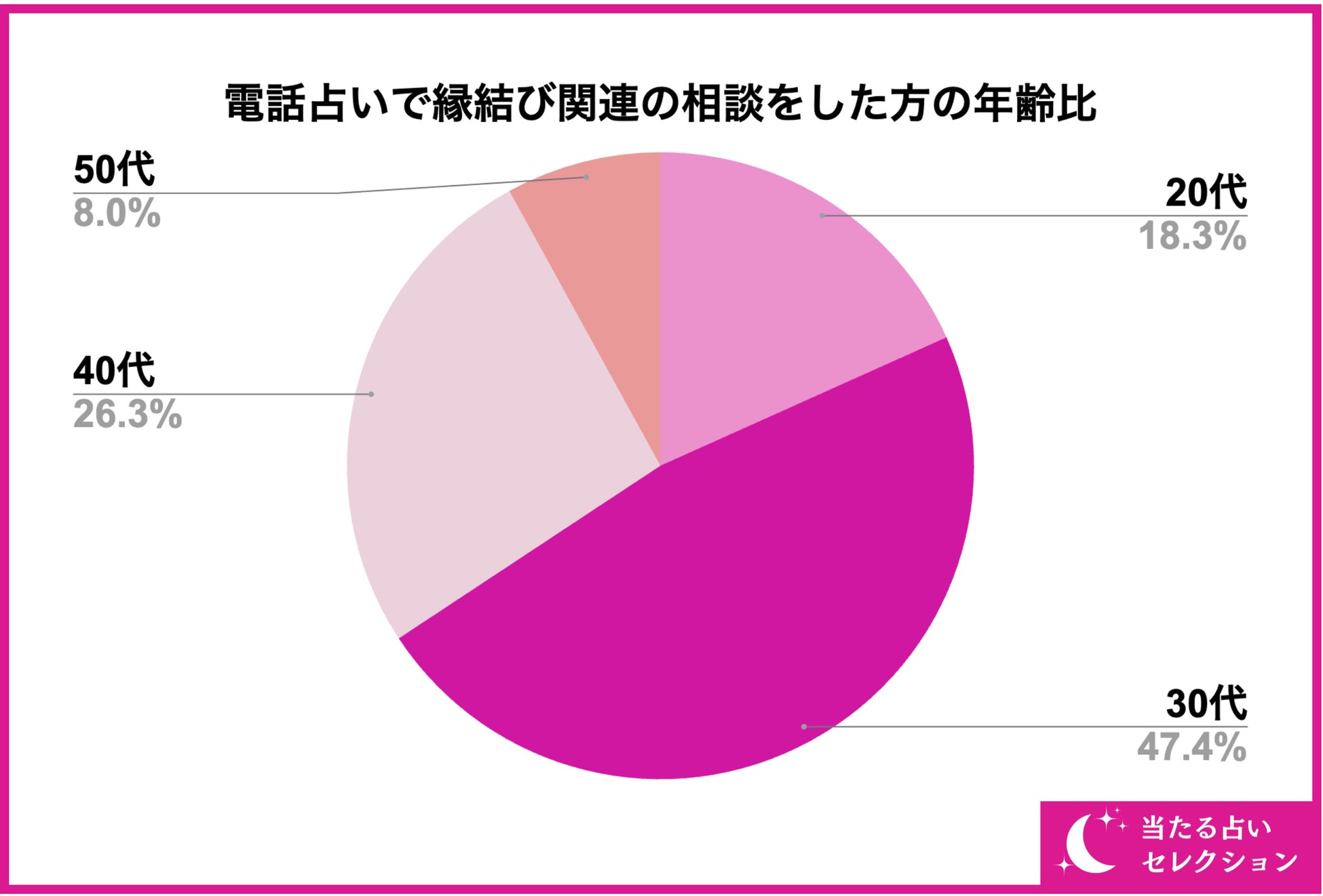 続いて電話占いで縁結び関連を相談する方の年齢比率ですが、下記の通り、20代〜40代がメインとなっています。中でも、30代の利用者数が全体の47%とかなり多くなっています。30代になると使えるお金が多くなったり、周囲が結婚する時期と重なるため相談する人が多いのかもしれません。