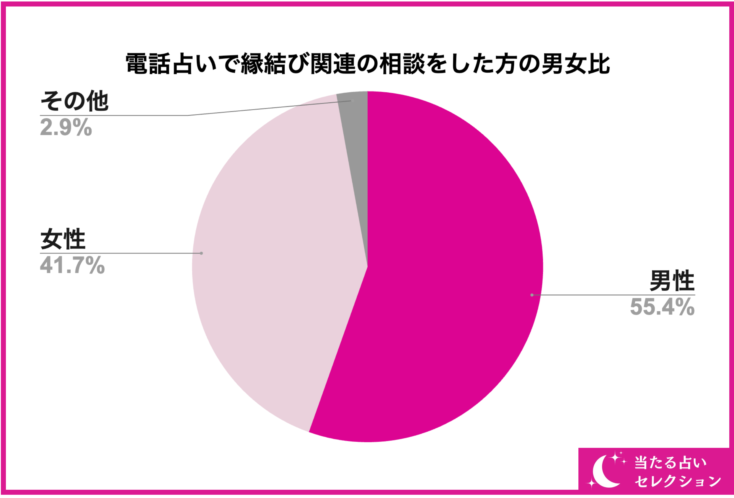 まず初めに、電話占いで縁結び関連を相談する方の男女比についてご紹介していきます。電話占いで縁結び関連を相談する男女の比率は下記の通り、男性が約55%、女性が約41%の結果となりました。電話占いで縁結び関連を相談する人は女性が大多数というイメージが多いかもしれませんが、約55%(半分以上)が男性という結果になりました。