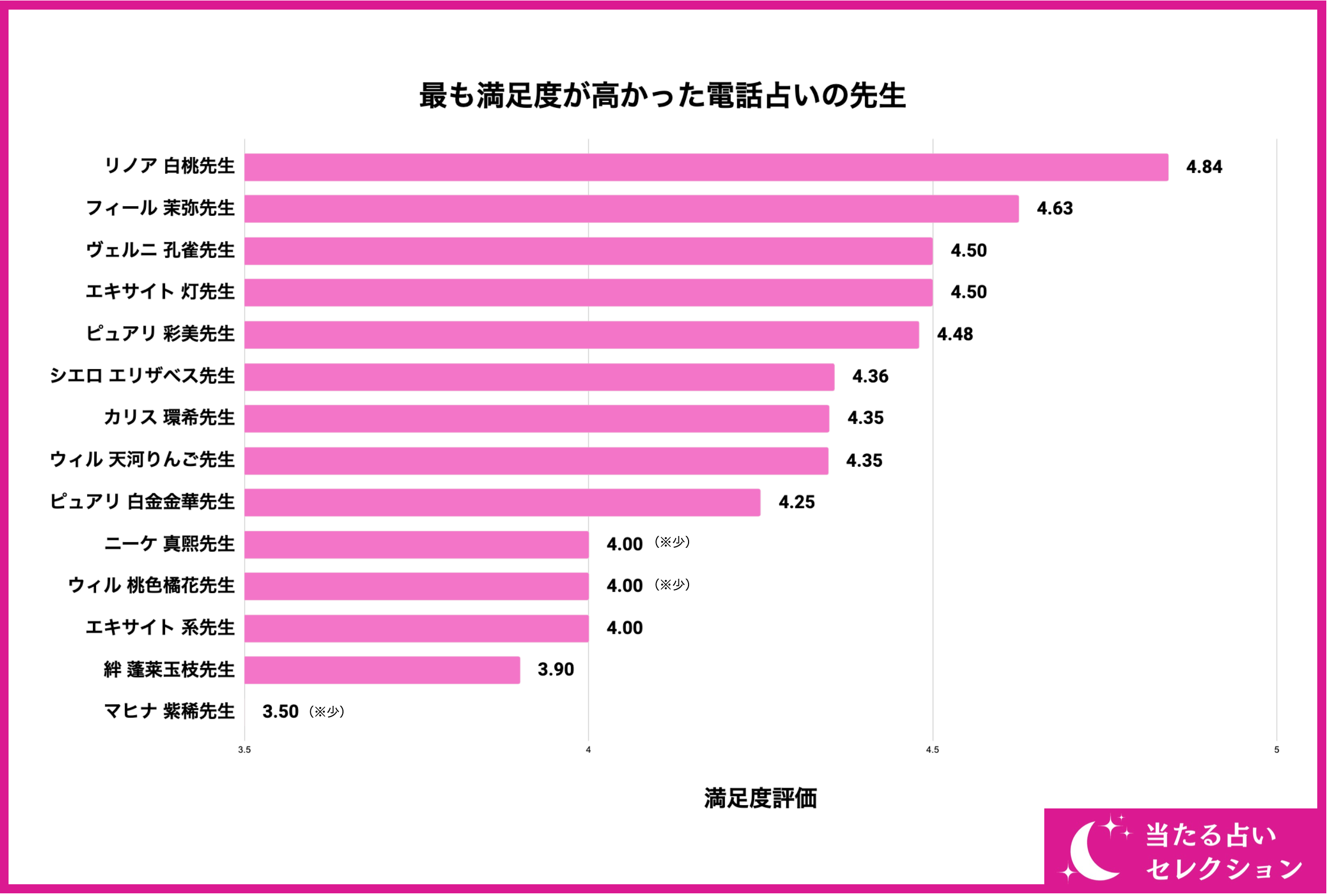 続いて、多くの電話占いの先生の中で最も満足度評価が高かったのはどの先生なのでしょうか?結論から言うと、下記の通り「リノア 白桃先生」が満足度評価「4.84/5.00」で最も評価が高いことが分かりました。リノア白桃先生は色々な記事や占いサイトでも特集が組まれているほど人気の先生のため、評価もばらつきやすいと思っている方もいるかもしれません。ですが、アンケート結果を確認してみると総合評価では他の占い師よりも高く、口コミ数も多いことから縁結びの相談がしやすい先生と言えるでしょう。