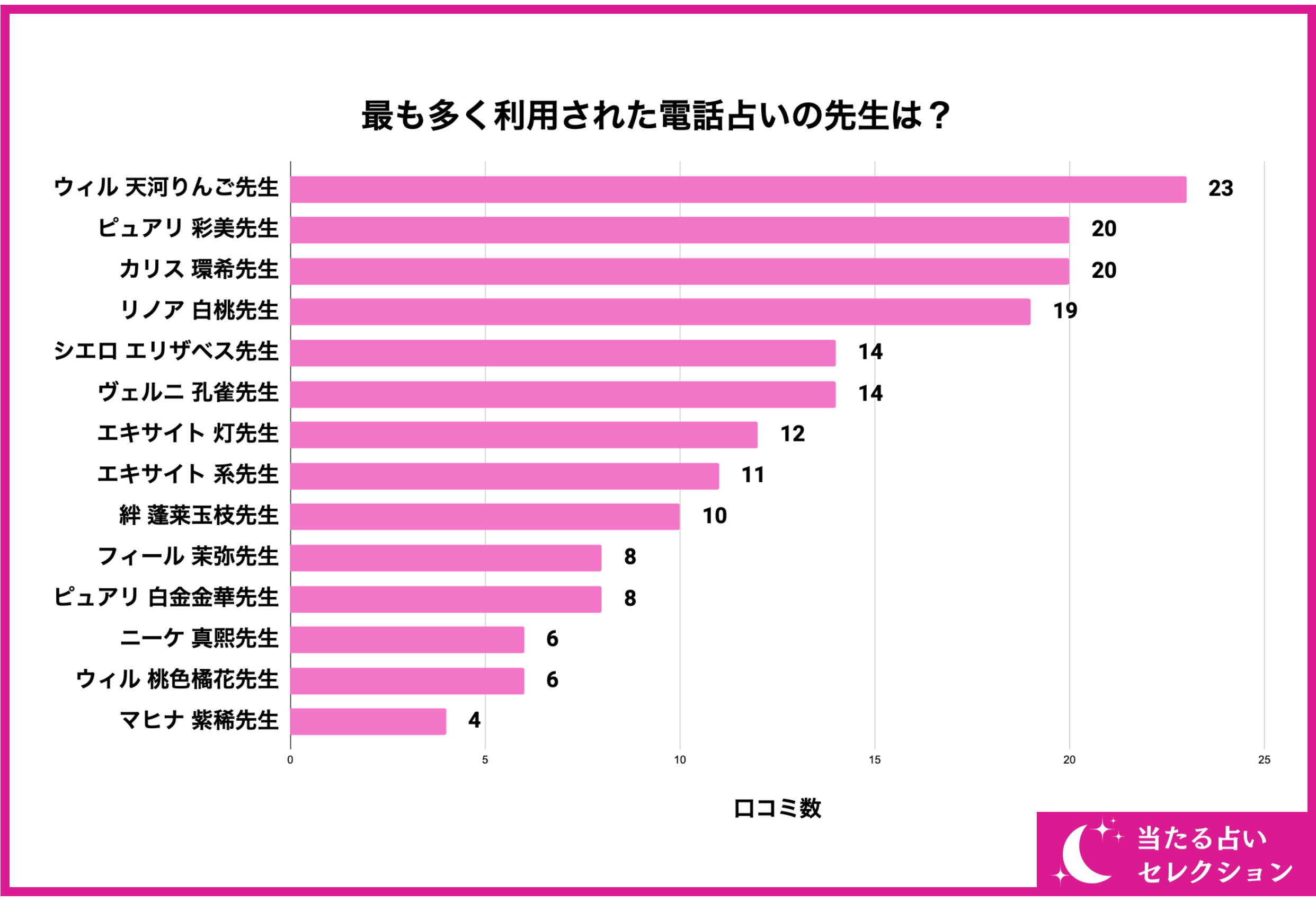 続いて、175名の利用者のうち最も多く利用された電話占いの先生をご紹介していきます。結論から言うと、『ウィル 天河りんご先生』や『ピュアリ 彩美先生』、『カリス 環希先生』といった有名な先生が上位となりました。やはり人気の先生は色々な記事や特集で見ることも多く、認知度や知名度が高いため利用者数も多くなっています。