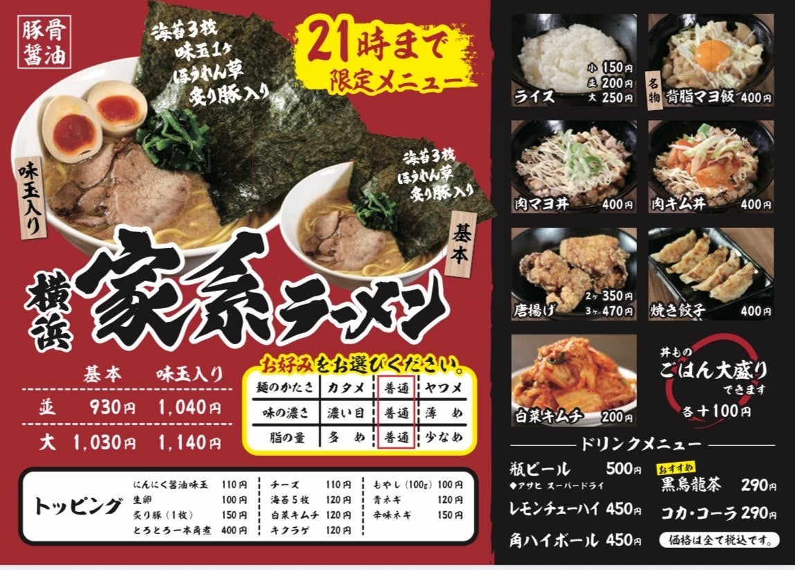 家系ラーメン(並) 930円 (21時まで限定)