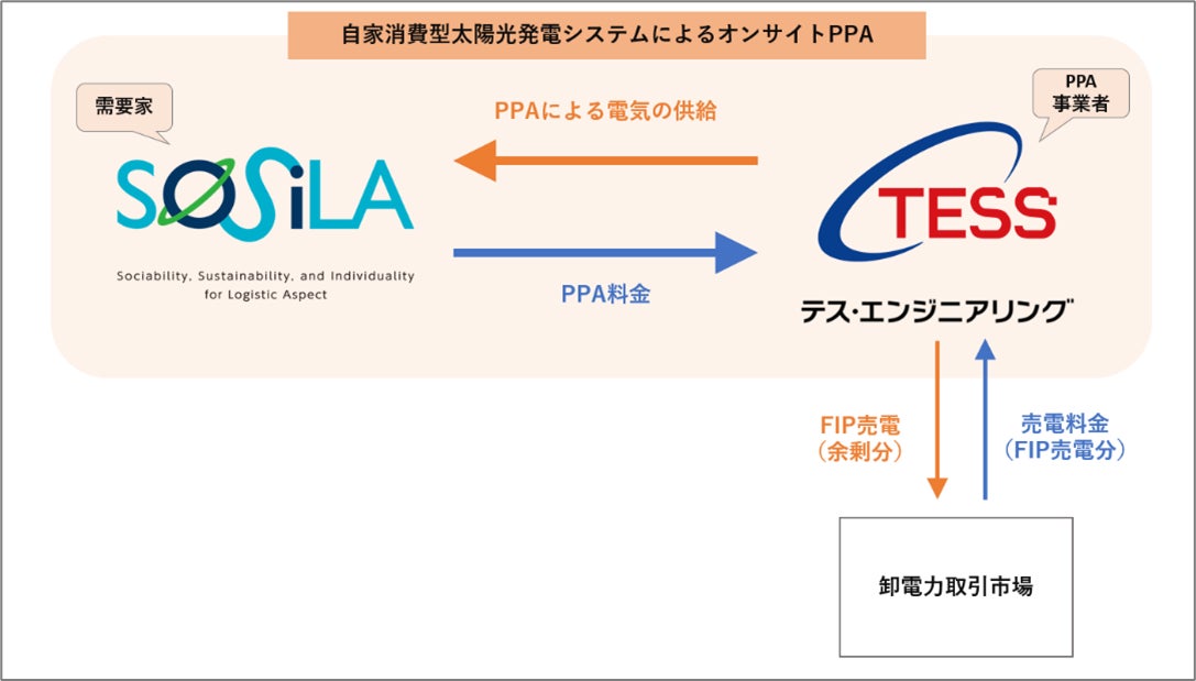 テスホールディングス株式会社(本社:⼤阪市淀川区、代表取締役社⻑:山本 一樹、以下「当社」)は、連結⼦会社であるテス・エンジニアリング株式会社(本社:⼤阪市淀川区、代表取締役社⻑:髙崎 敏宏、以下「テス・エンジニアリング」)が、この度、住友商事株式会社が開発する物流施設「SOSiLA(ソシラ)シリーズ」へ重点投資を行うSOSiLA物流リート投資法人(所在地:東京都中央区、代表者名:執行役員 佐藤 友明、以下「SOSiLA」)のSOSiLA春日部向けに、オンサイトPPAモデル※1を活⽤した⾃家消費型太陽光発電システムによる再⽣可能エネルギー電気の供給(以下「本事業」)を2024年9月より開始いたしましたのでお知らせいたします。