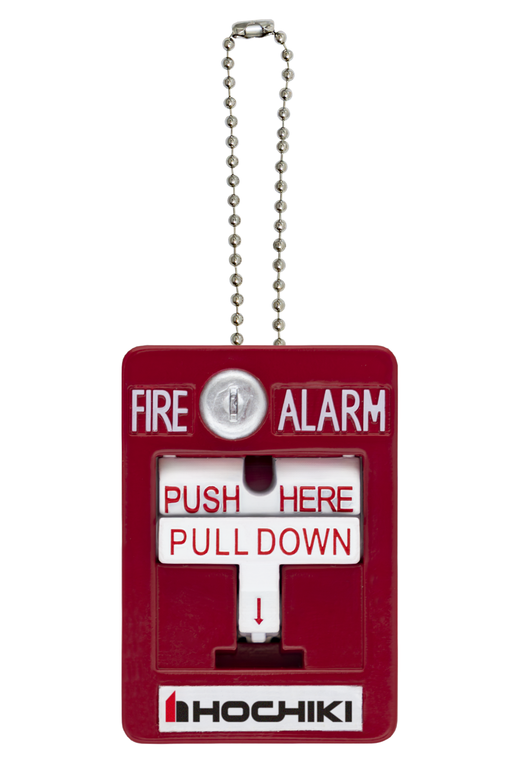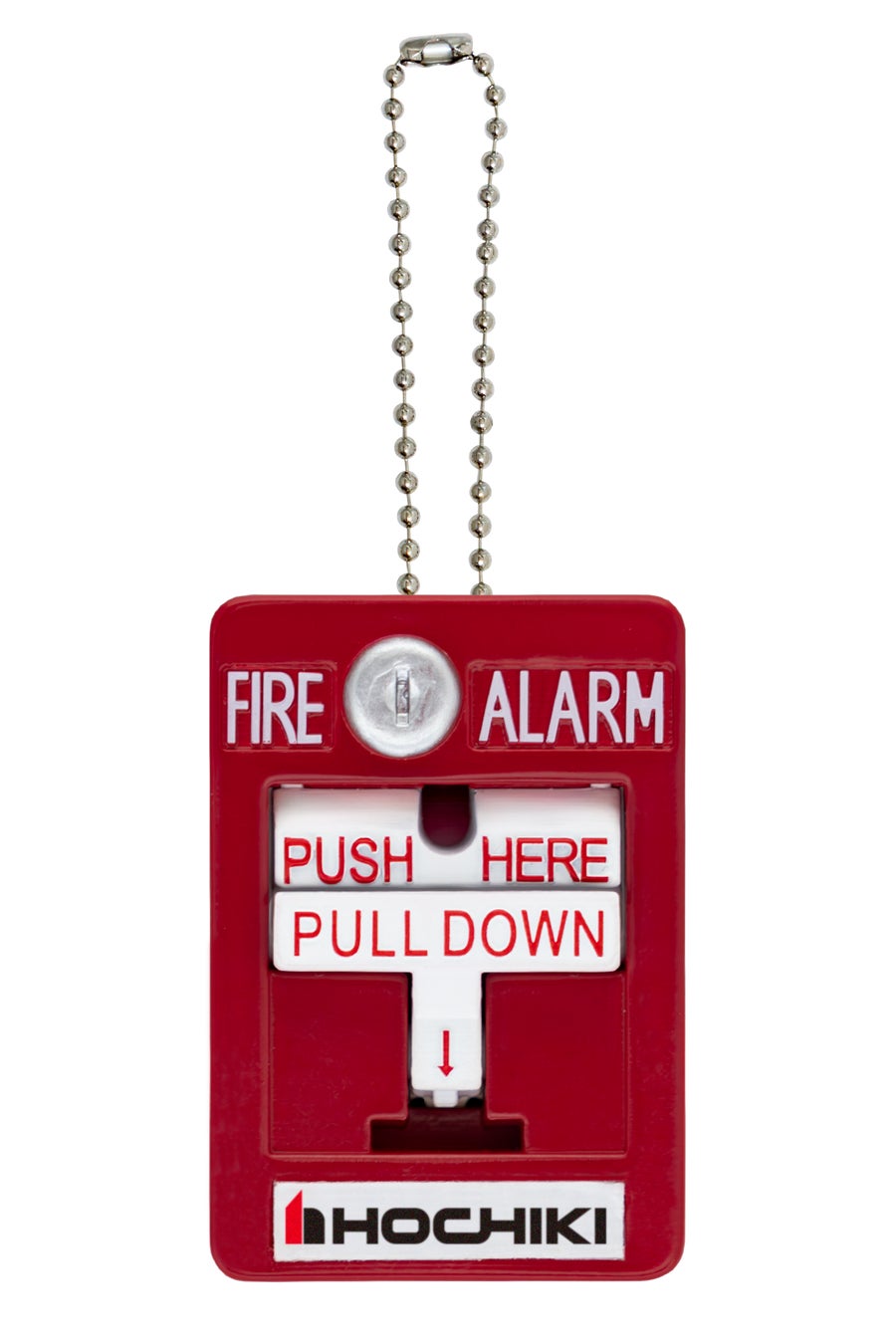 日本では火災発信機は赤くて丸い形状で「押す」タイプが一般的ですが、海外では日本とは異なる様々な形の火災発信機があります。そのひとつがアメリカを中心に普及している四角い「引く」タイプです。本商品はその特徴的なデザインを再現し、さらに実際の機器の警報音を模したサウンドを搭載しています。