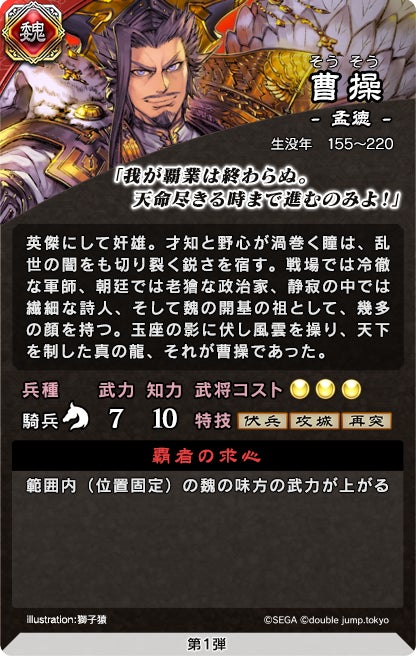 株式会社セガより「三国志大戦」のライセンス許諾を受け、double jump.tokyoが開発した軍勢カードバトルゲーム。 アーケード版「三国志大戦」に登場した武将はもちろん、「魁 三国志大戦」のために描きおこされた新しい武将たちも登場。