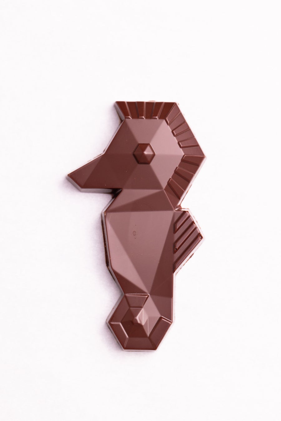 タツノオトシゴを象ったタブレットショコラ。カカオ75%のオリジナルブレンドショコラ ノワールとマダガスカル産カカオ45% ショコラ オ・レの2種をご用意しました。