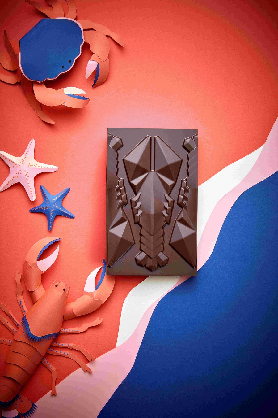 オマール海老のデザインが目を引くタブレットショコラ。カカオ75%のオリジナルブレンドのショコラ ノワールとごく薄く焼いたクレープ生地を細かく砕いて作るフイヤンティーヌの組み合わせ。ショコラのくちどけにサクサクとした食感をお楽しみいただけます。