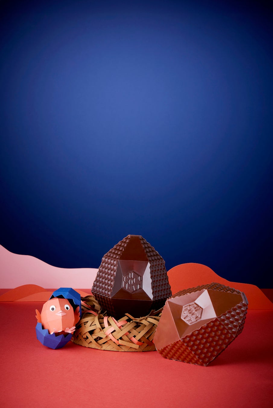 回転する卵にインスパイアされたアートの様なイースターエッグは、毎年この時期限定で登場する人気のショコラ。風味豊かなマダガスカル産カカオ45%のショコラ オ・レの殻を割ると、中から卵や鐘、貝などを象ったフリチュールが出てきます。