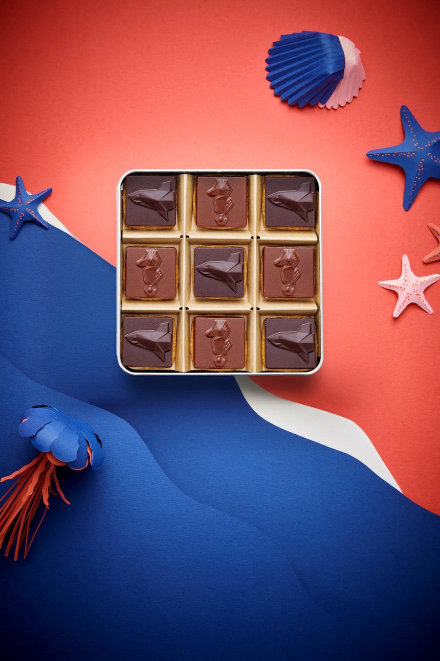 かわいらしいタツノオトシゴやサメをモチーフにしたデザインのショコラを、一口サイズの正方形のビスケットにトッピング。ビスケットはアラン・デュカスの思い出の味を再現したバターの風味たっぷりのピュール・ブール。2種類のショコラ(カカオ75%ショコラ ノワールとカカオ45%ショコラ オ・レ)の組み合わせ。