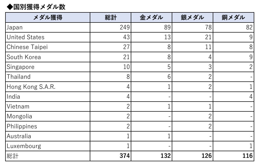 本大会では、複数の国・地域の選手が表彰台に立ち、国際大会としての競技レベルと多様性を示す結果となりました。国別の獲得メダル数では、日本が最多、続いてアメリカ合衆国、台湾が上位に入り、開催国・日本におけるピックルボールの普及および競技力向上と、海外勢との健全な競争関係が明確に表れました。