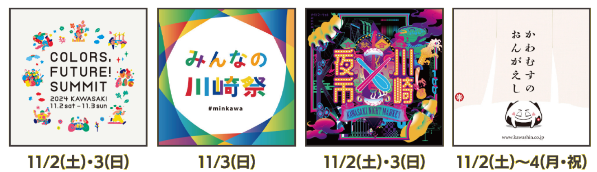市制100周年を盛り上げるべく、11月2日(土)~4日(月・祝)にかけて、「Colors, Future!Summit 2024」「みんなの川崎祭」「川崎夜市」「かわむすのおんがえし」を川崎駅周辺で同時開催!富士見公園会場にお越しの際は、ぜひこちらのイベントもお楽しみください!