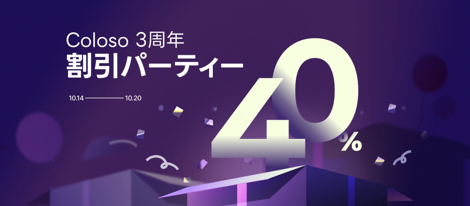 \最大40%OFF/ 7日間限定<Coloso3周年割引パーティー>を実施します!