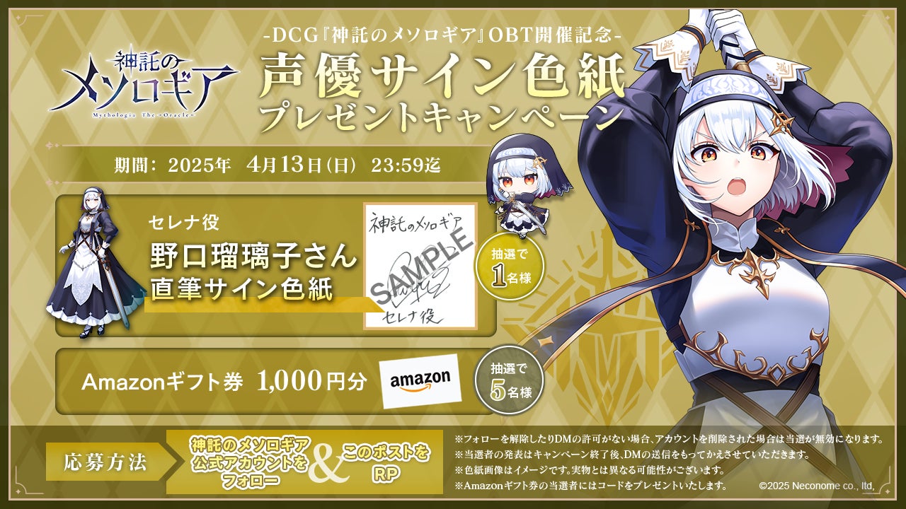 株式会社ネコノメ(本社:東京都中央区、代表取締役:工藤ショーン)は、現在オープンβテスト実施中のデジタルカードゲーム『神託のメソロギア』において、出演声優の直筆サイン色紙やAmazonギフト券が抽選で当たる5日間連続プレゼントキャンペーンの第4弾を開催したことをお知らせいたします。