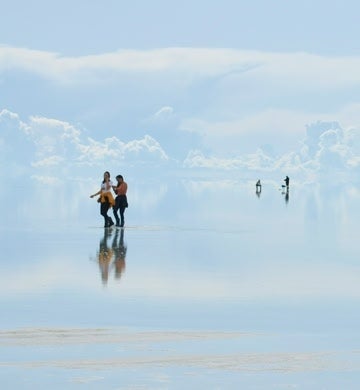 ウユニは、世界最大級の塩原が広がる“塩の大地の果て”です。雨季には塩原の表面に雨水が薄く張り、その水面が空をくっきりと反射して、地面全体が鏡のように見える現象が起きます。これが“鏡張り”と呼ばれる景色で、空と地面の境界が消えたような写真を撮影できることから、まさに一生に一度の体験として人気があります。乾季には、塩の結晶がつくる幾何学模様と星空観察がメインになり、季節によって全く違う表情を楽しめます。