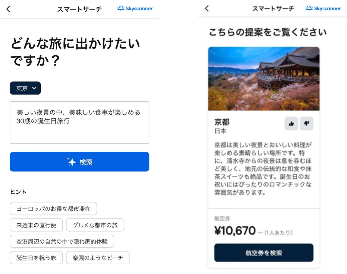 スカイスキャナーではAI旅行提案ツール「スマートサーチ」の提供を開始し、旅行の目的や気分を自然な言葉で入力するだけで、最適な旅行先を提案する直感的な検索体験を実現しています。