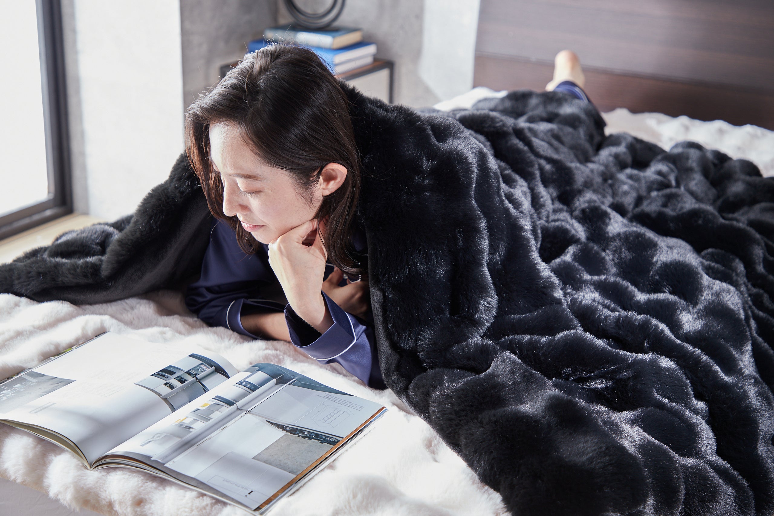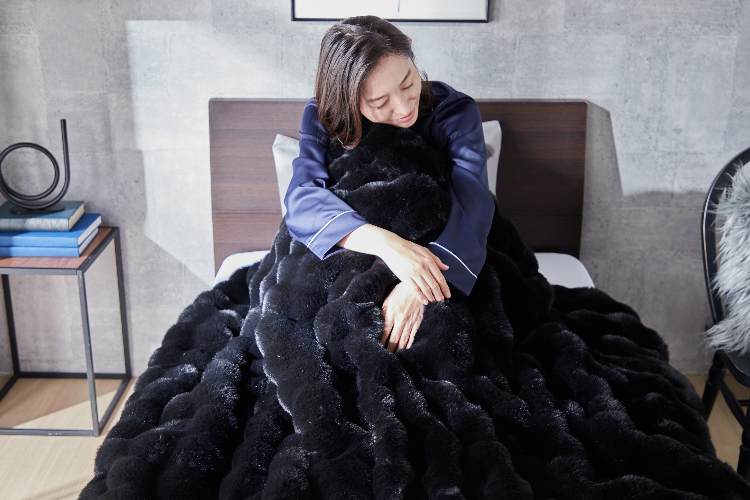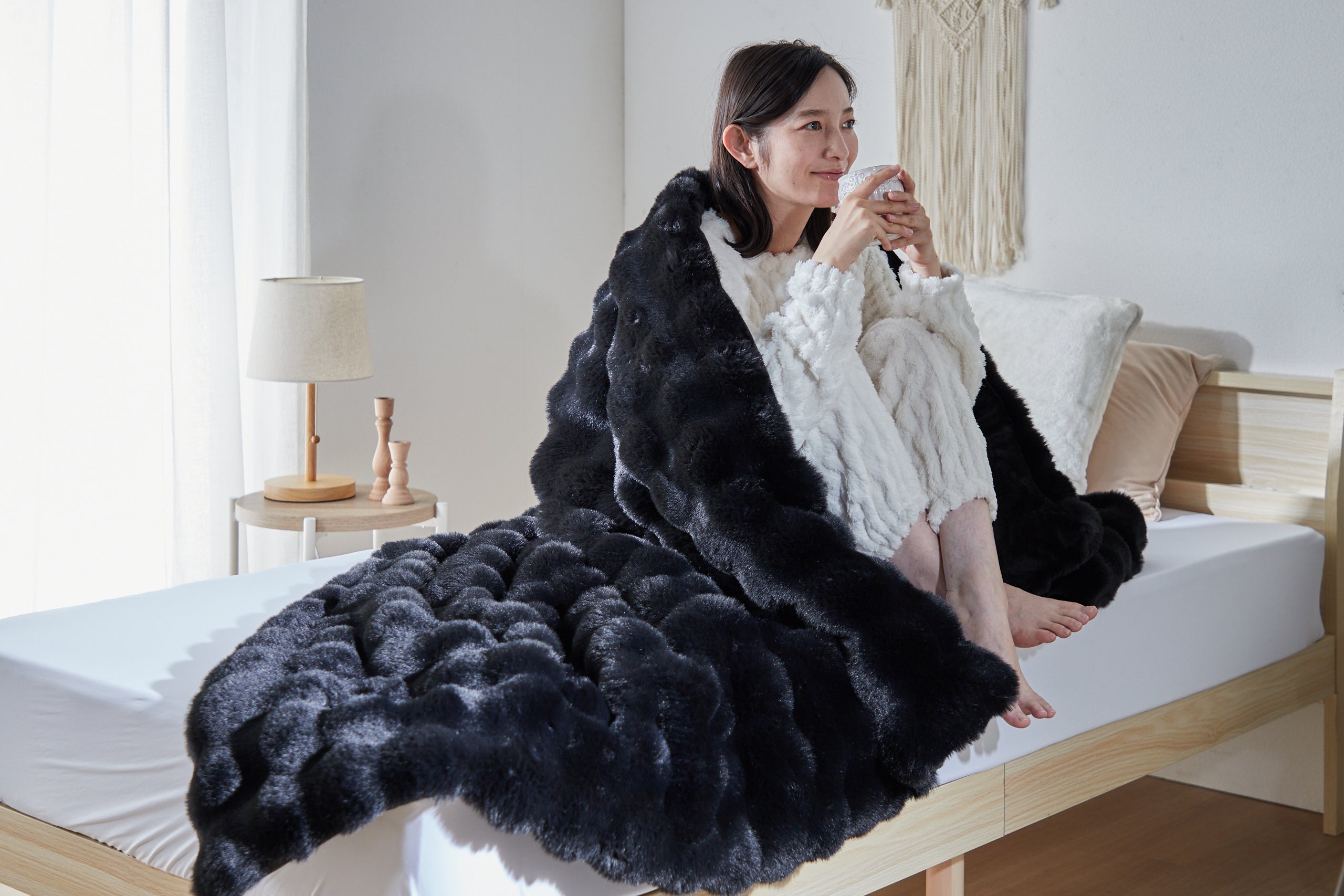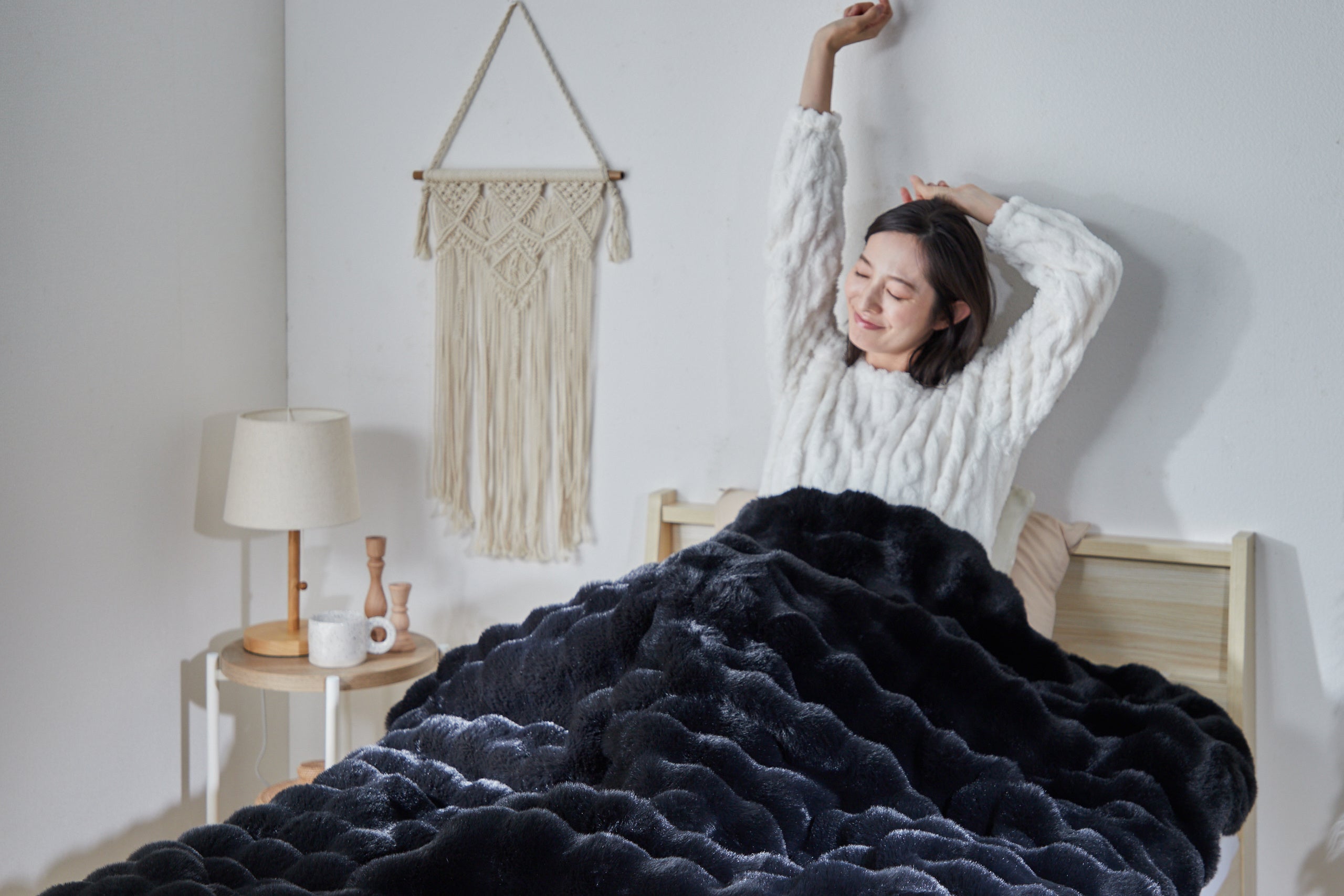 さらに最新作では、エアロゲルの保温性能をより高めるための「5層構造」をAQUA独自で考案。保温性の高いアルミシートと湿度や蒸れを調整する吸放湿わたを追加し、ラビットファー調とミンクファー調の2種類の高密度マイクロファイバー生地で挟んだ5層構造で、mofua史上最も暖かく快適な毛布が完成しました。