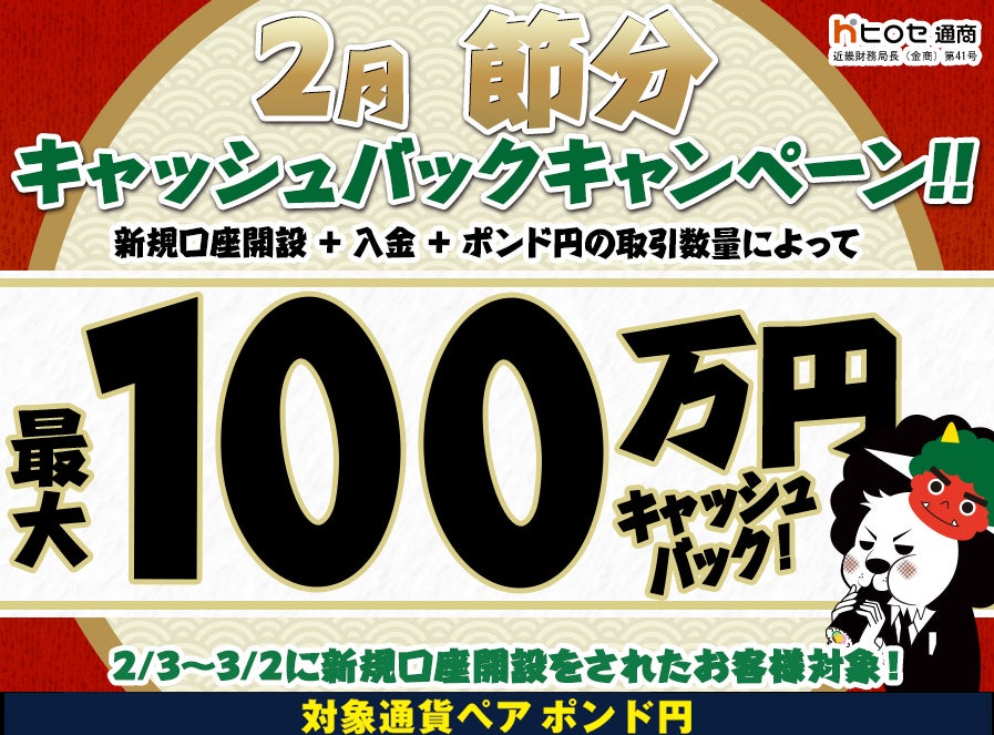 【新規口座開設限定】2月節分最大100万円キャッシュバックキャンペーン!を実施