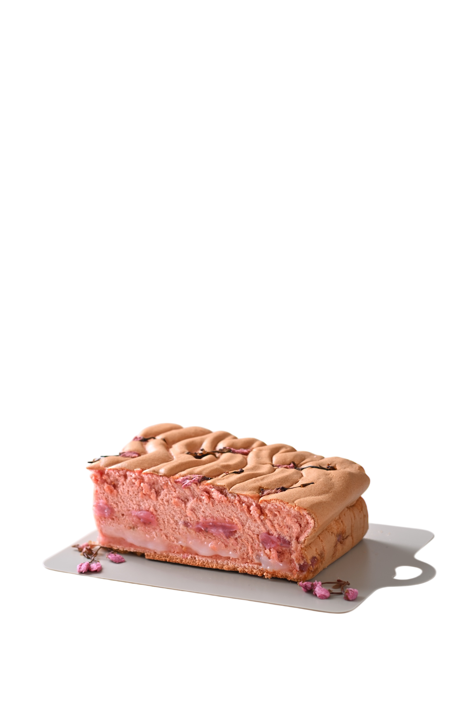 しっとりふわふわの桜風味カステラ生地に、なめらかで上品な高級羽二重餅と、香り高い桜あんを贅沢に練り込みました。さらにトッピングには、ほのかな塩味がアクセントとなる桜の塩漬けをあしらい、