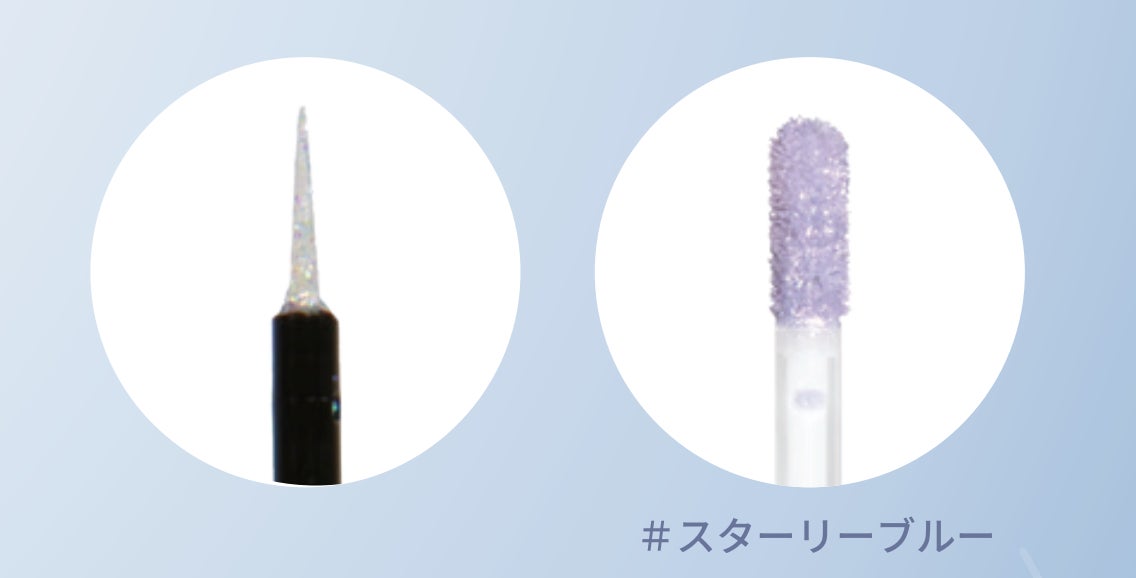 既存のカラーラインナップに、新たな輝きを添える「スターリーブルー」。繊細なシルバーラメがきらめくくすみブルーは、うるうると透明感のある目元を演出し、夏のファッションをワンランクアップ。。既存の5色は、大粒のグリッターをしっかりとキャッチし、ピンポイントに塗布できるよう、先端がとがった柔らかいゴム製アプリケーターを採用しています。一方、新色のスターリーブルーは、繊細なラメをムラなく広げ、まぶた全体に均一な輝きを与えるために、3mmの極細チップを採用しています。