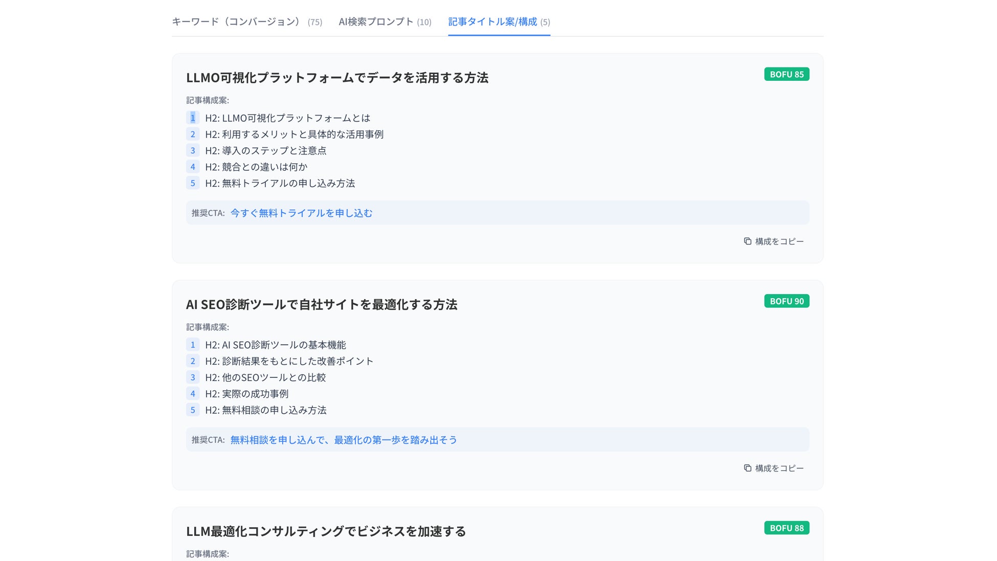URLを入力するだけで、狙うべき検索意図・質問・記事構成が数分で可視化されます。