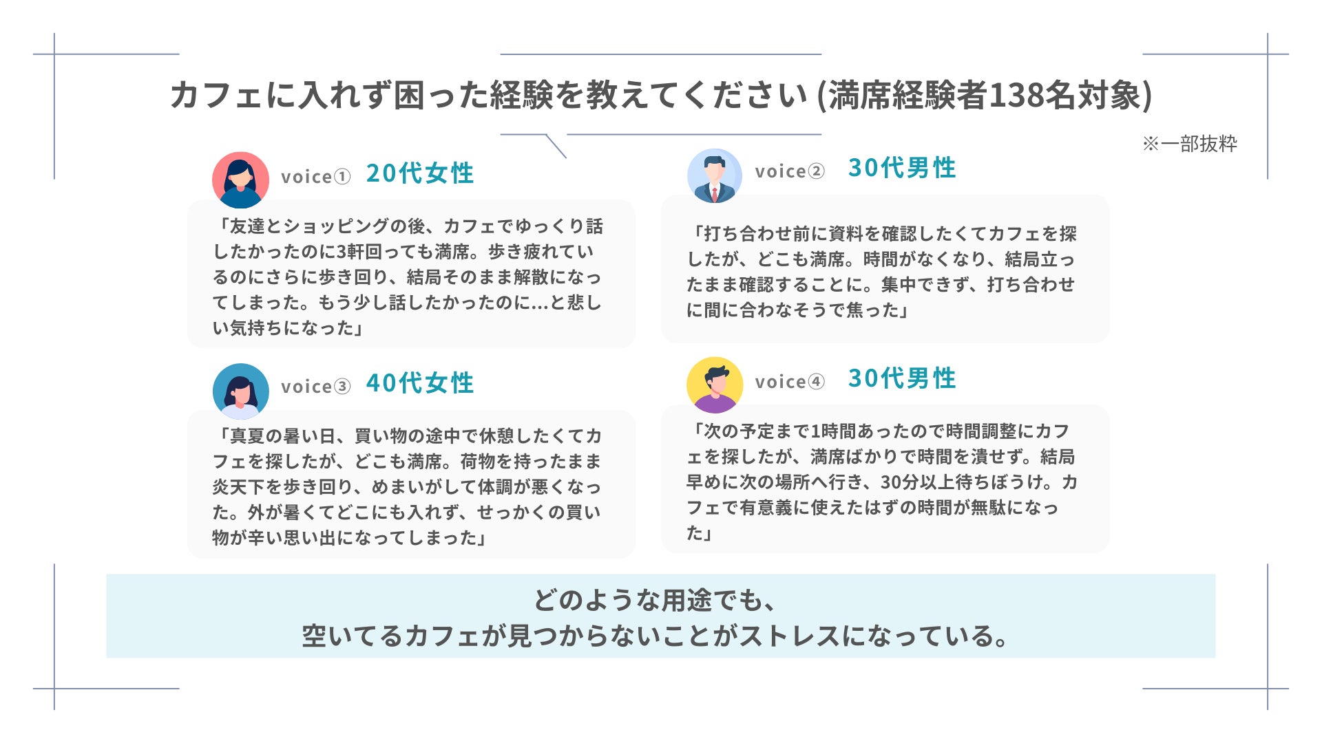 カフェは街に多数存在するものの、リアルタイムの空き情報がないため、利用者は平均2-3軒を回り、10-20分をかけて探す非効率な行動を強いられています。